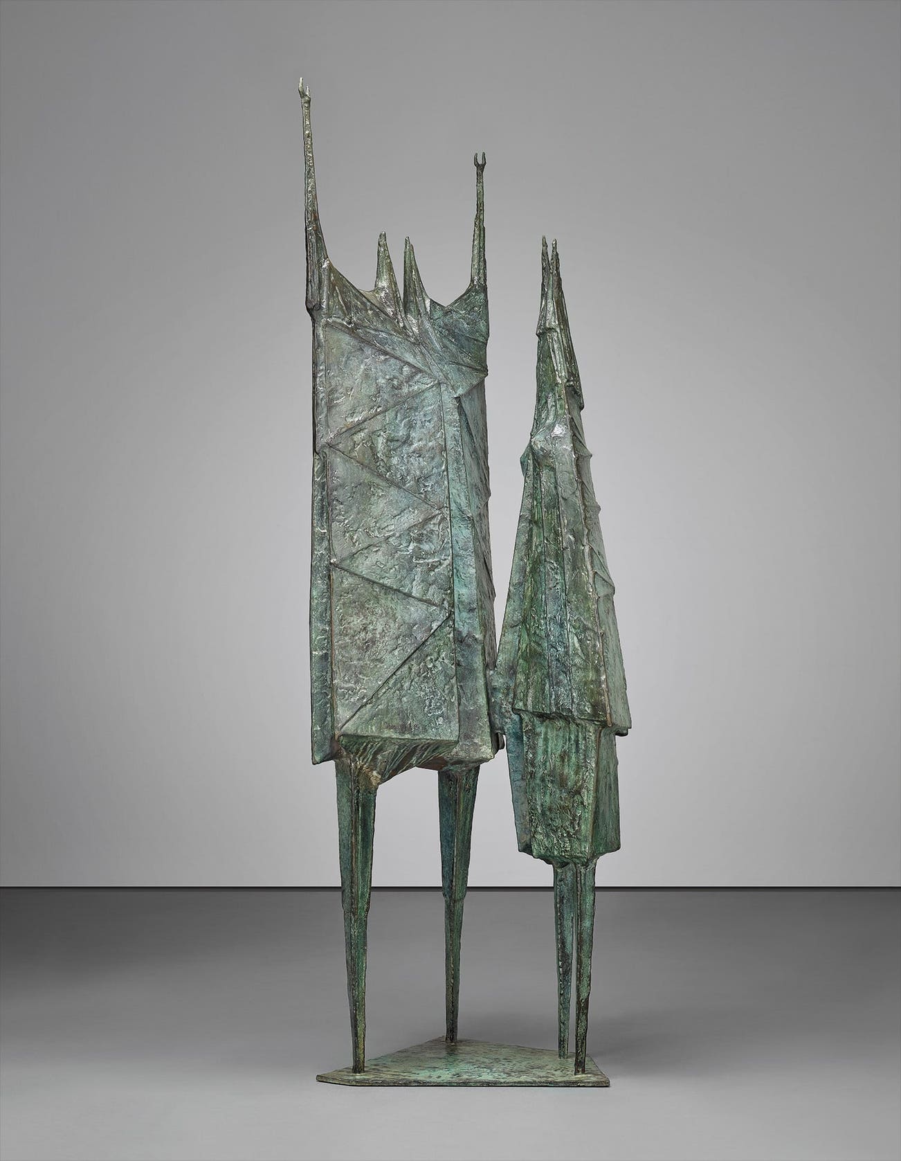 A seminal theme in the British sculptor Lynn Chadwick’s oeuvre, Teddy Boy and Girl II is a defining three-dimensional masterpiece of post-war British sculpture. Encompassing a new modern aesthetic in a world rebuilding itself after the turmoil of the Second World War, the present work was commissioned by Venezuelan writer, journalist and politician Miguel Otero Silva, after viewing a smaller variation of the work at the 1957 to 1959 travelling exhibition Ten Young British Sculptors. The exhibition featured Chadwick’s sculptural work alongside a selection of artist contemporaries, namely Kenneth Armitage, Eduardo Paolozzi and William Turnbull. Organised by the British Council, the exhibition began at Sao Paulo’s IV Biennial of the Museum of Modern Art, where Chadwick’s work was shown alongside the paintings of William Scott and Peter Lanyon. The exhibition travelled to Rio de Janeiro, Buenos Aires, Montevideo, Santiago and Lima, finally concluding in Caracas. Housed in the collection of Otero Silva, a patron of Caracas’ Galería de Arte Nacional which opened in 1976, the present work is the first of the four works from the edition borne from Otero Silva’s commission and is the only work to include a base plate, making the work a rare and life size formulation of one of the artist’s key sculptural concerns: the Teddy Boy and Girl.