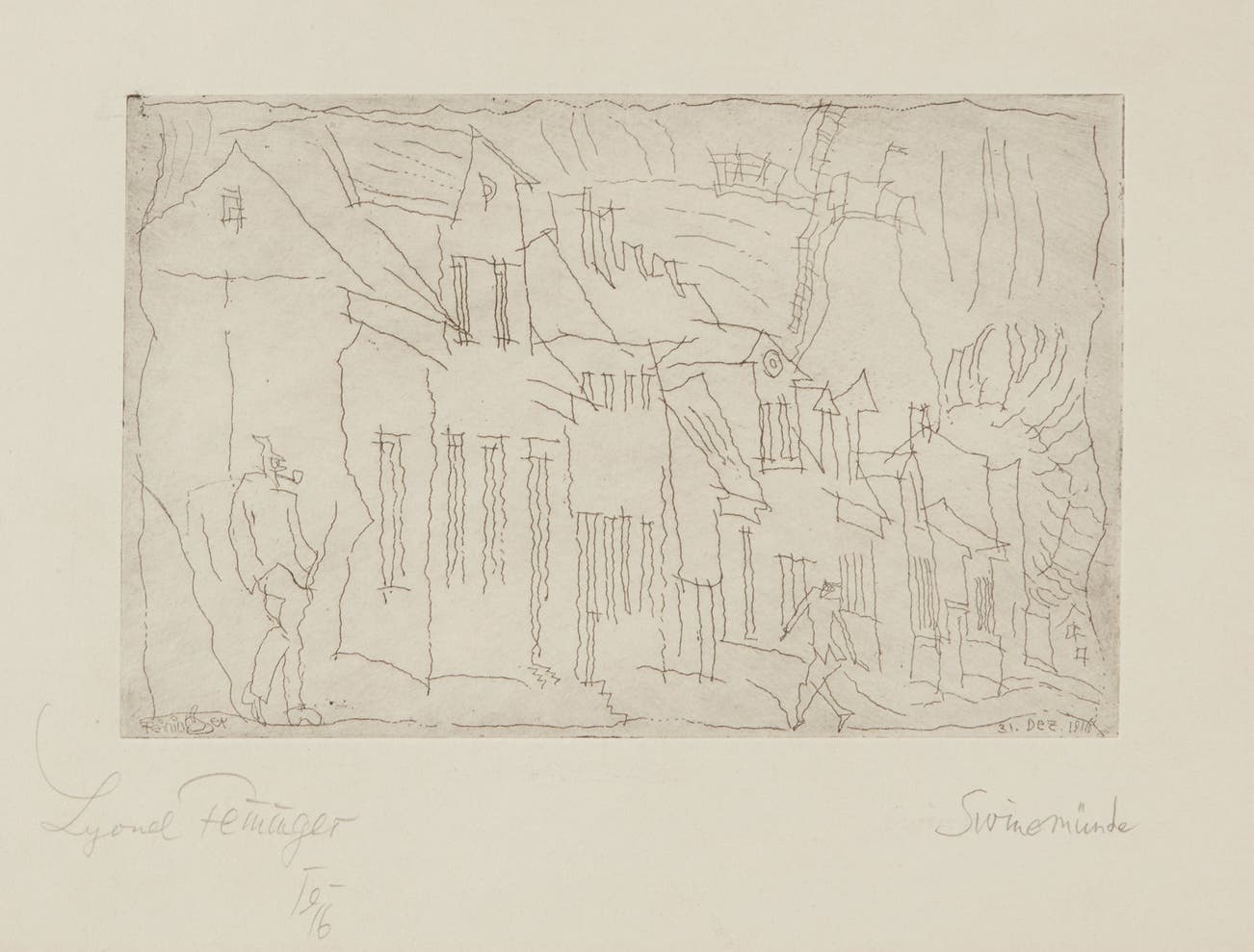 Signed, titled, and dated '1916' in pencil, one of only two known proofs, with the Feininger Estate inkstamp and stamped/annotated 'GE No. 60' on the reverse, framed.