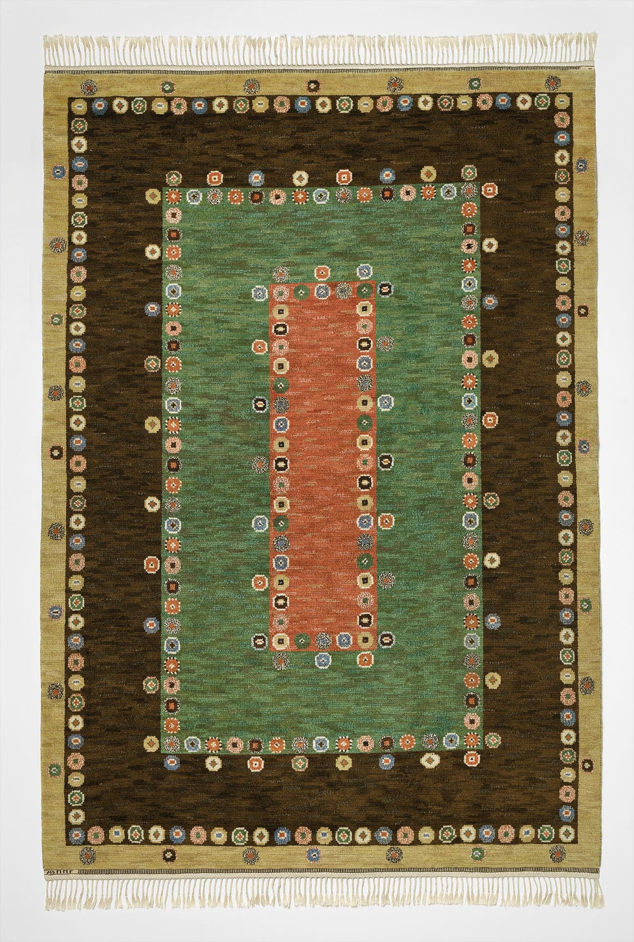 Handwoven by Gunni Andersson and Marta Pålssonat at Märta Måås-Fjetterström AB, Båstad, Sweden. Woven with manufacturer's mark AB MMF.