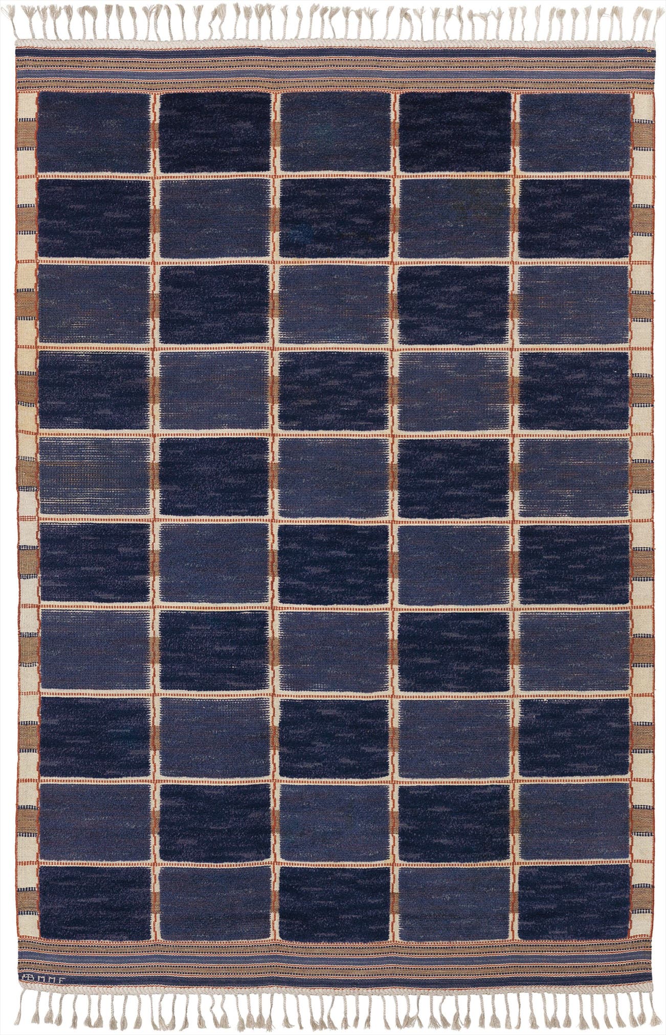 Produced by Märta Måås-Fjetterström AB, Båstad, Sweden. Woven with manufacturer’s mark AB MMF.