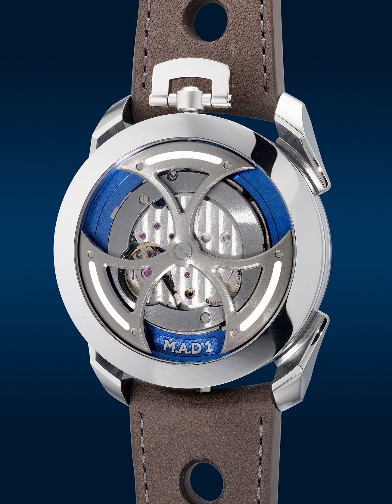 -The M.A.D.1 looks towards the future. A unique fusion of science fiction aesthetics, the piece transports the wearer to the cinematic worlds of classics including Blade Runner, Videodrome and The Fifth Element. The sky-blue band, adorned with eye-catching, oversized circular cut-outs, is exquisitely paired with the 42mm stainless steel dial and an oversized titanium and tungsten winding rotor. Its timekeeping is wrapped around its caseband using revolving minute and hour rings powered by a modified Miyota 821A movement.