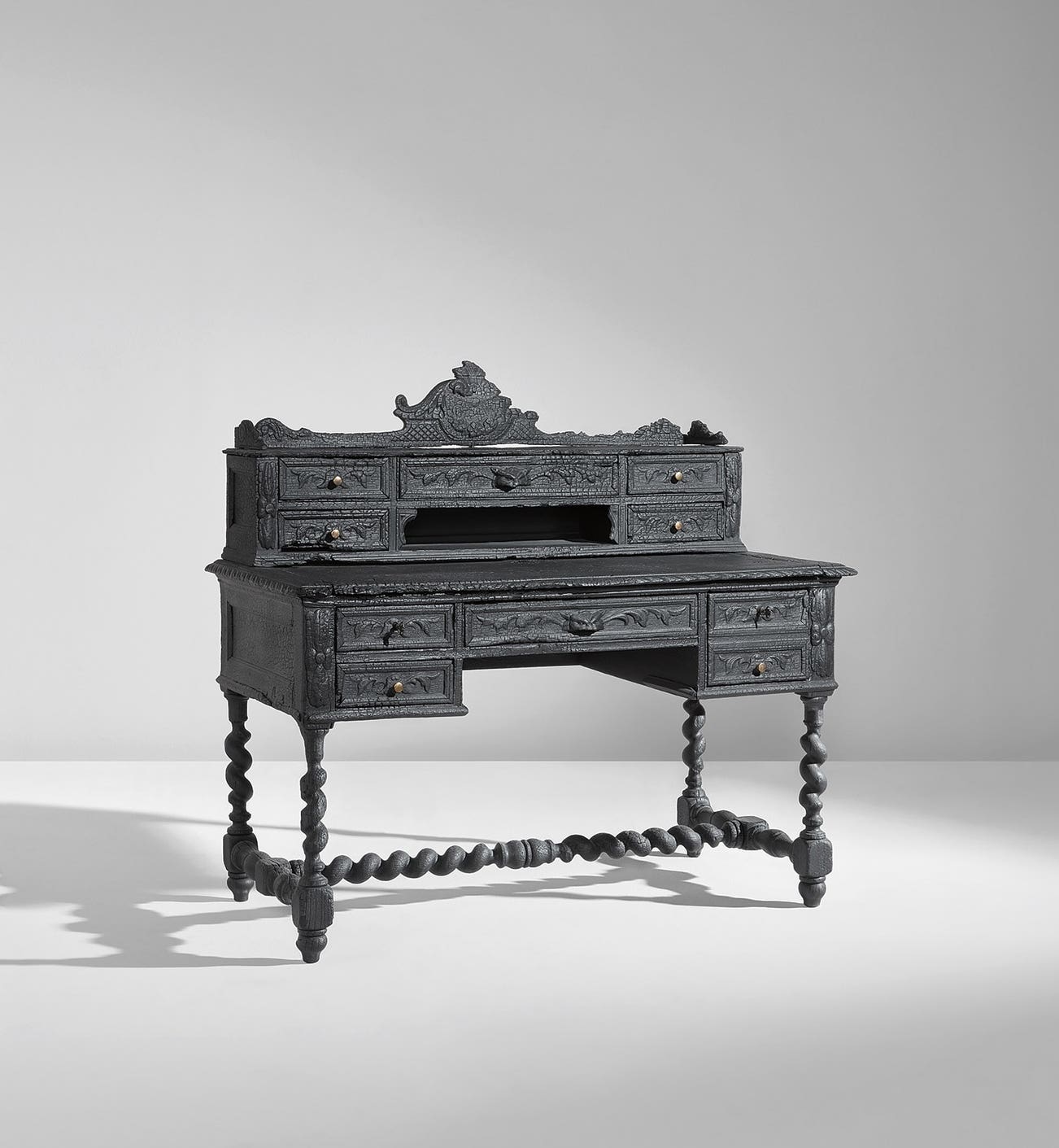 Charred pre-existing writing desk, clear epoxy resin, brass.