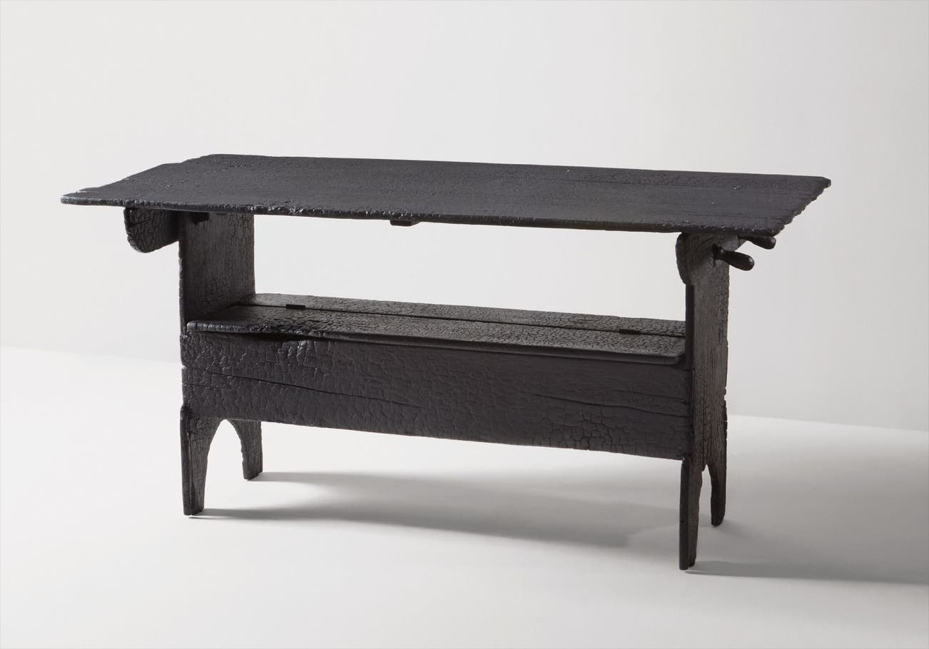 Charred nineteenth-century pine farm table, epoxy resin.