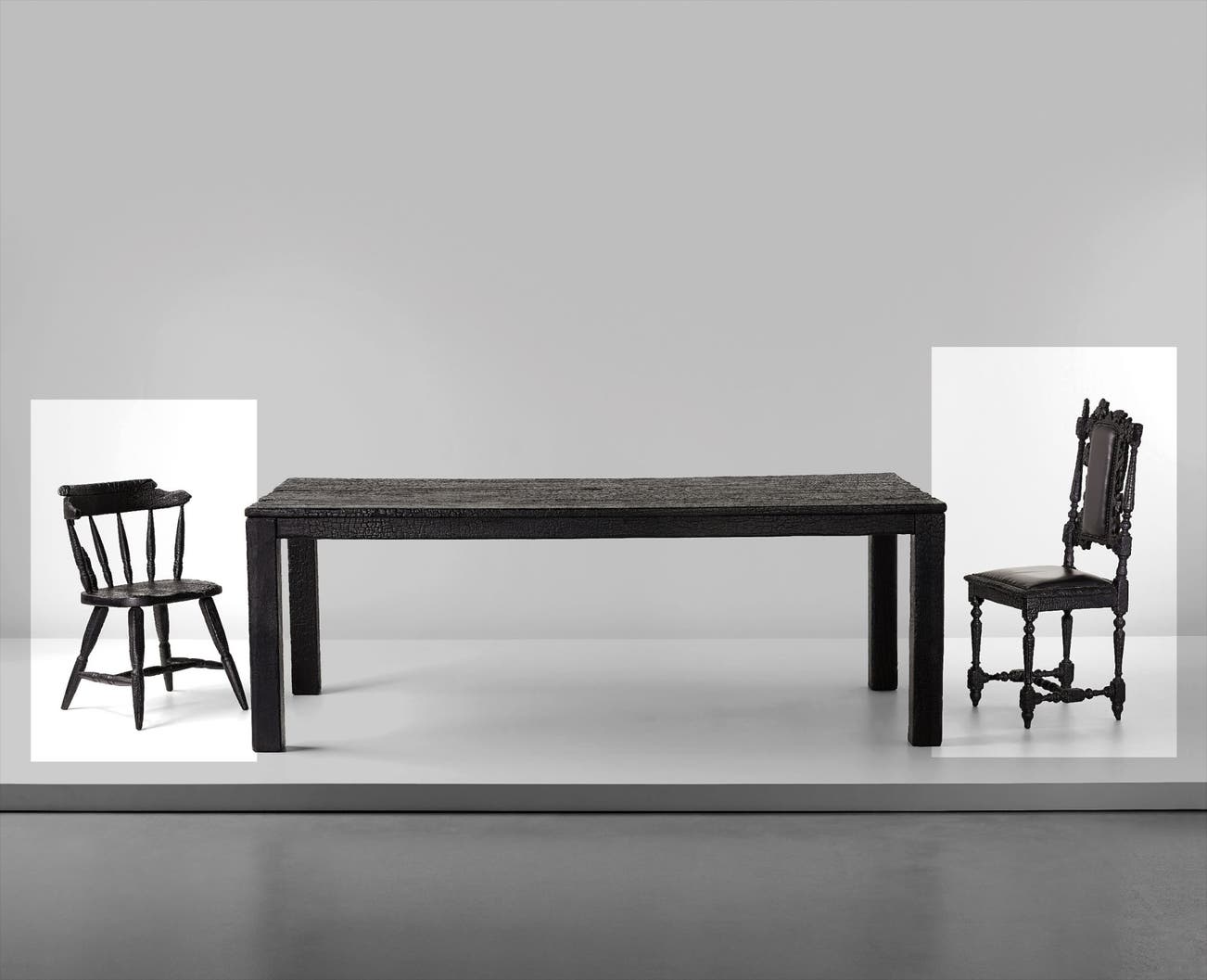 Charred pre-existing chairs, epoxy resin, brass nail heads, leather.