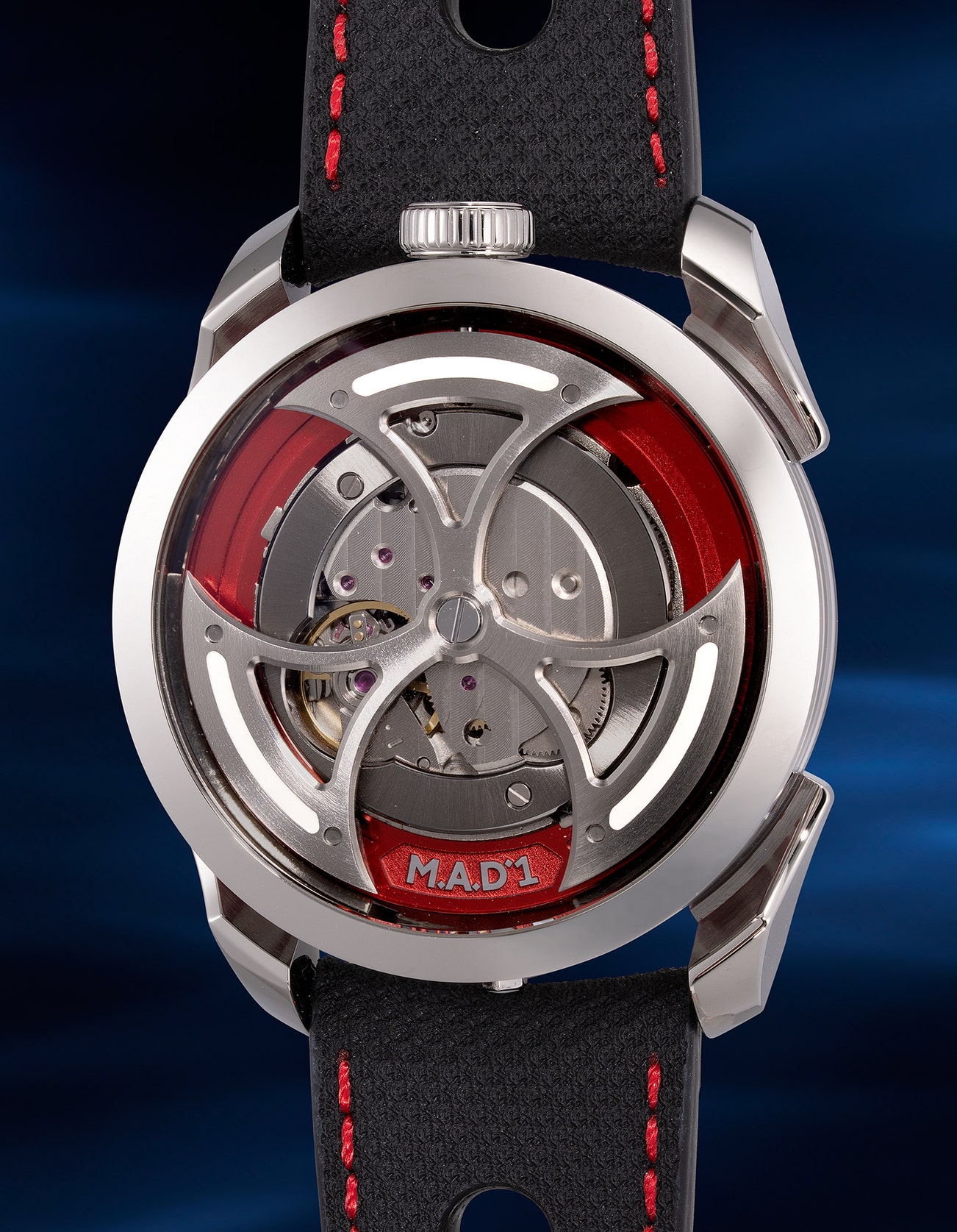 - Riding on the overwhelming support and popularity, in 2022, MB&F decided to unveil the M.A.D.1 "Red". This version features a bold cherry red color scheme and subtle design updates, including a slimmer bezel and a classical round winding crown. The time is displayed through a sapphire crystal aperture at 6 o'clock, with red and black rings indicating the hours and minutes.