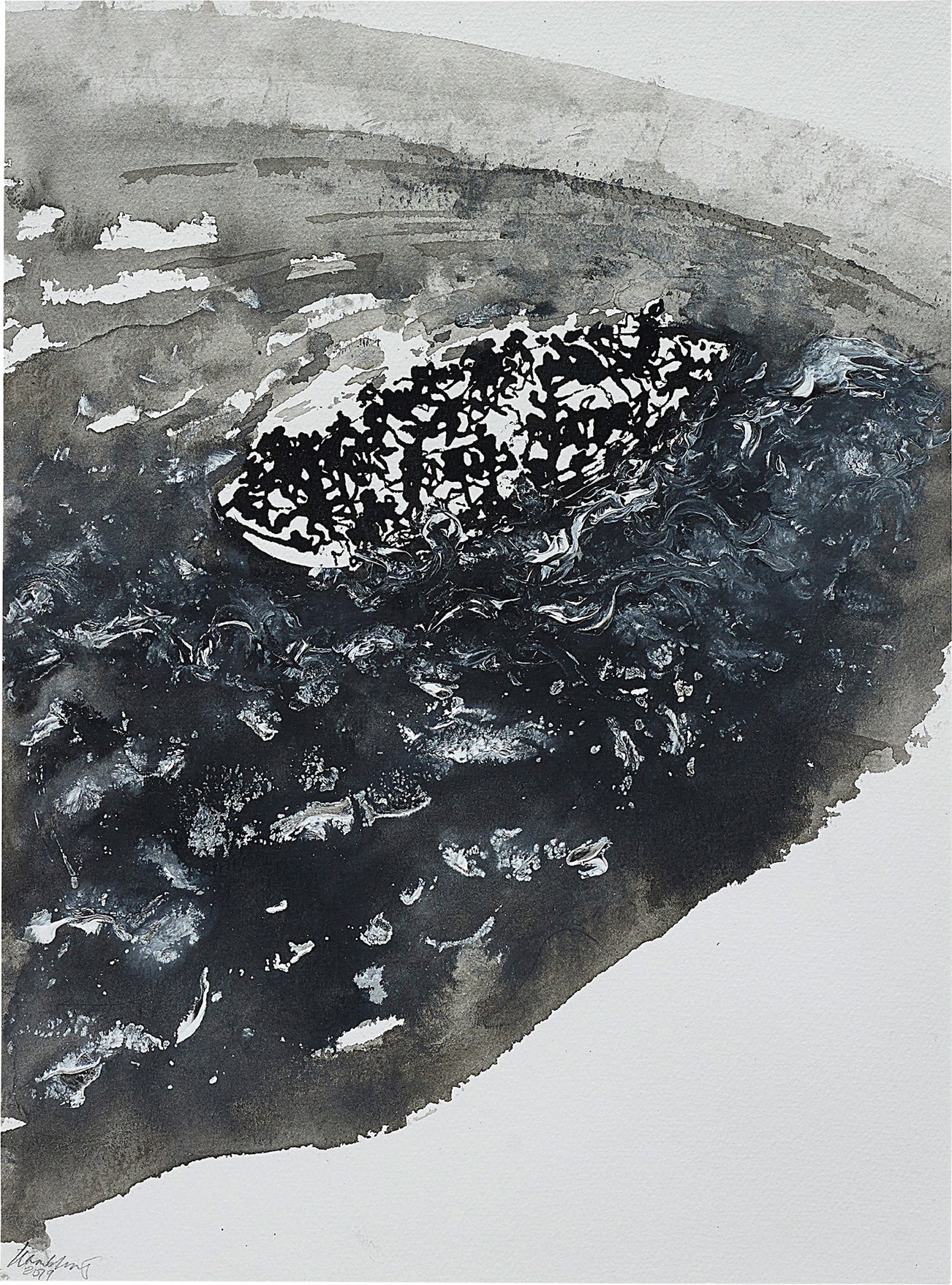 “2019 presents a direct graphic response to the migrant crisis and the continuing tragedy of migrants being drowned at sea, the subject of my oil painting 2016 which is held in Tate collection. The titles, 2016, and in this work, 2019, act like a zoom lens, telescopically focusing our attention onto the immediate facts of the image - a particular boat on a doomed journey - and then widening out into symbols, a microcosm of the events that took place, and continue to take place, in the years in which these works were made. Isolated and bereft of coordinates, the boat is an island on the brink of sinking but remains afloat; its inhabitants on the edge of destruction.” - Maggi Hambling