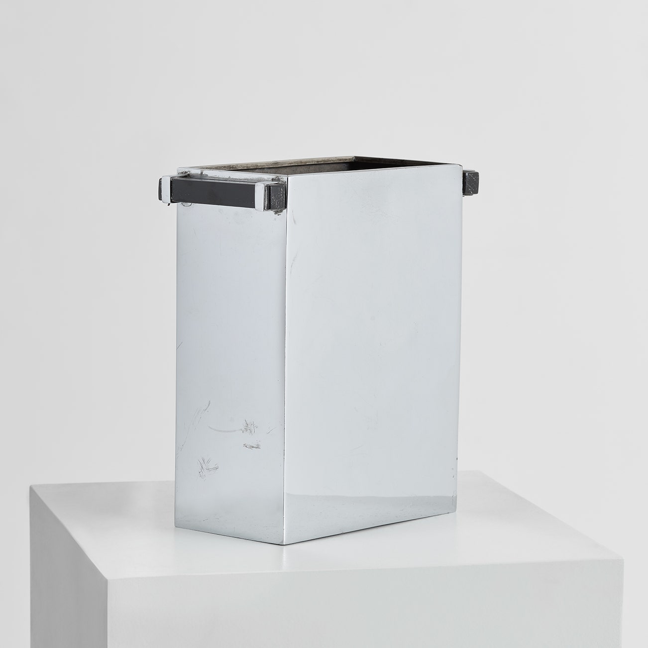 Chrome-plated brass, ebonised wood.