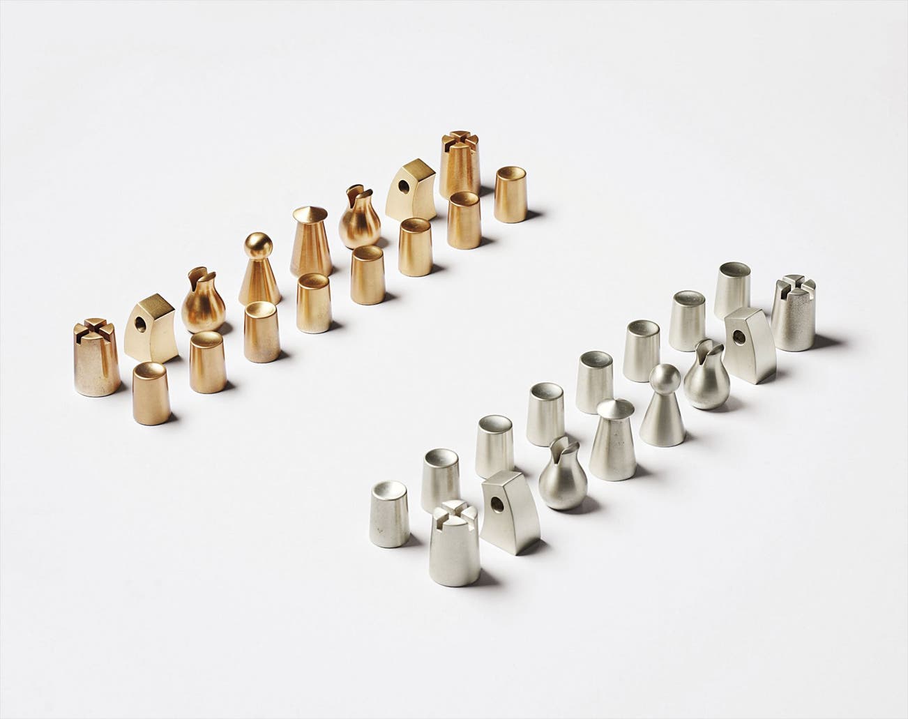 Chess set comprised of 32 pieces in precious metal, contained in the original gray felted box with brass fastening and blue baize lining.