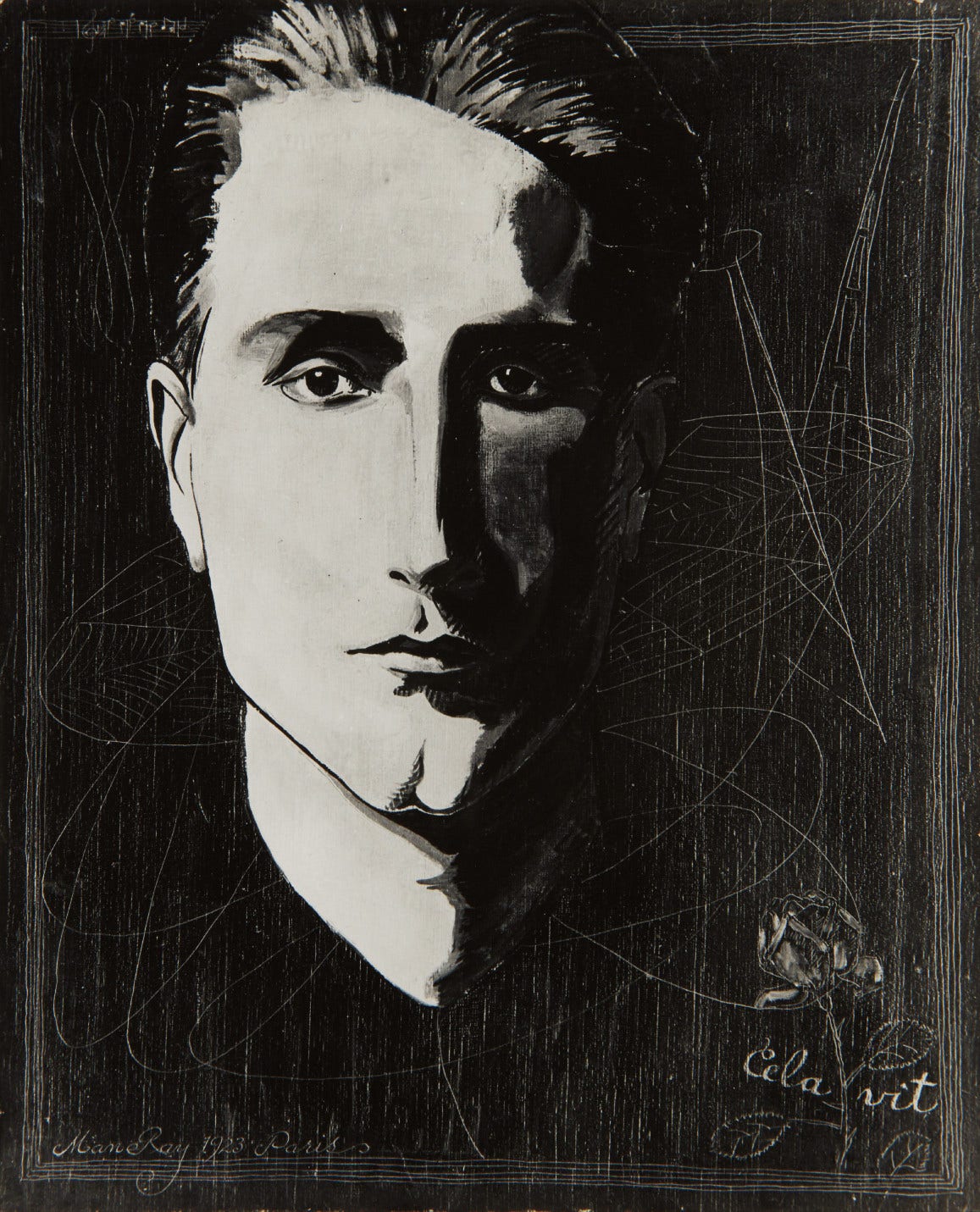 This photograph, of Man Ray’s 1923 painted portrait of Marcel Duchamp, demonstrates Man Ray’s thoroughly interdisciplinary approach to making art and the extent to which photography influenced his painting. He wrote that he “set about to do a portrait of [Duchamp] in oils, but, influenced by the many photographic portraits I had made of him, the work was in black and sepia, mimicking a photograph. I had him pose for me once or twice to verify some details in his features. I introduced some imagined motives in the black background so that the painting was not too factual. It was neither a painting nor a photograph; the confusion pleased me and I thought this should be the direction my future painting would take” (Self Portrait, p. 186).
