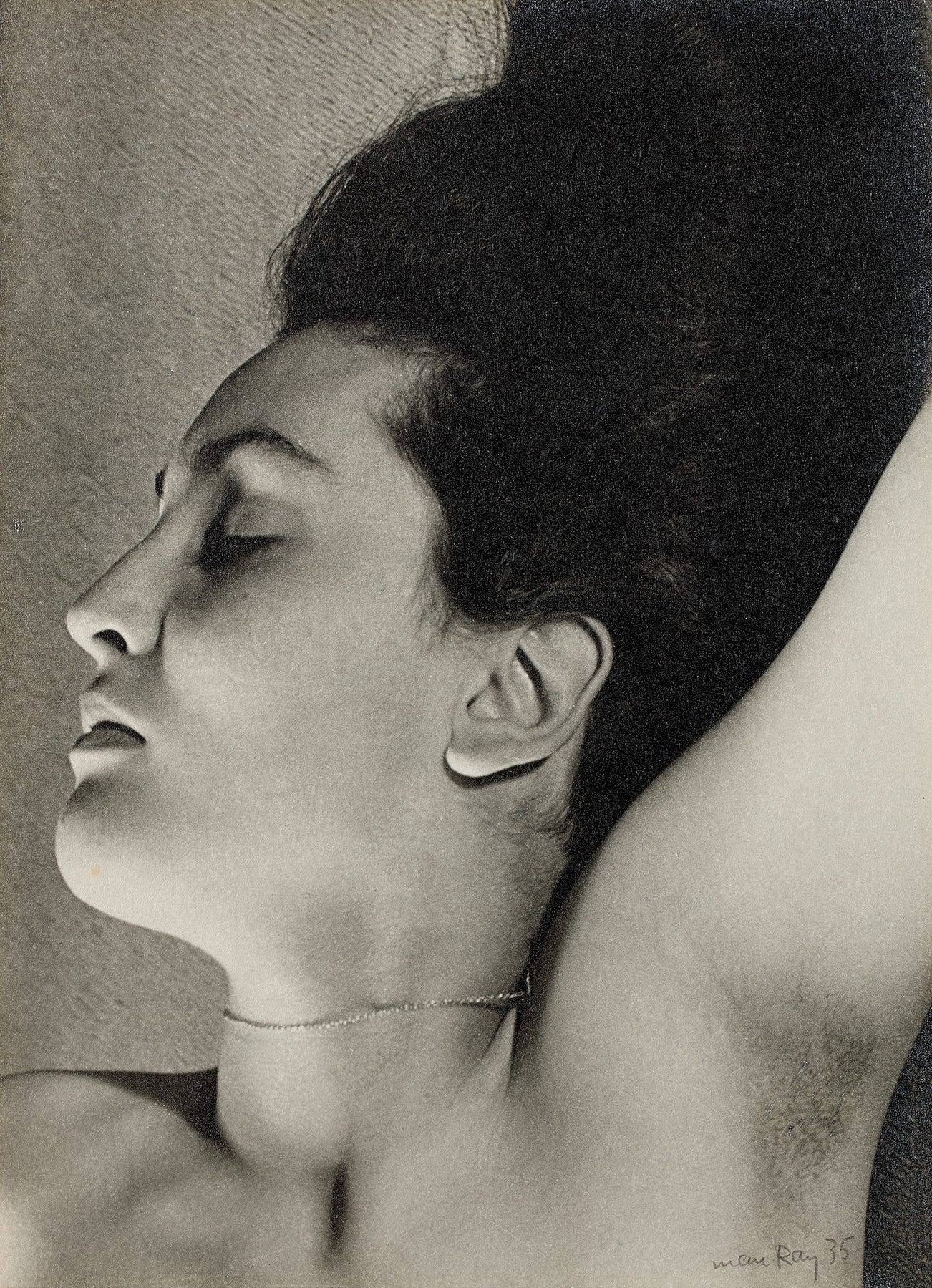 Man Ray was introduced to the German-born Oppenheim in Paris by their mutual friend Alberto Giacometti in the early 1930s. Oppenheim posed repeatedly for Man Ray, resulting in some of his best-known photographs from that decade, including Erotique Voilée and, notably, The Primacy of Matter over Mind which shows Oppenheim in a similar pose to the image offered here, lying down with her arm draped above her head. In his autobiography, Man Ray called Oppenheim ‘one of the most uninhibited women I have ever met,’ and the images he made with her show her active engagement in their photographic sessions.