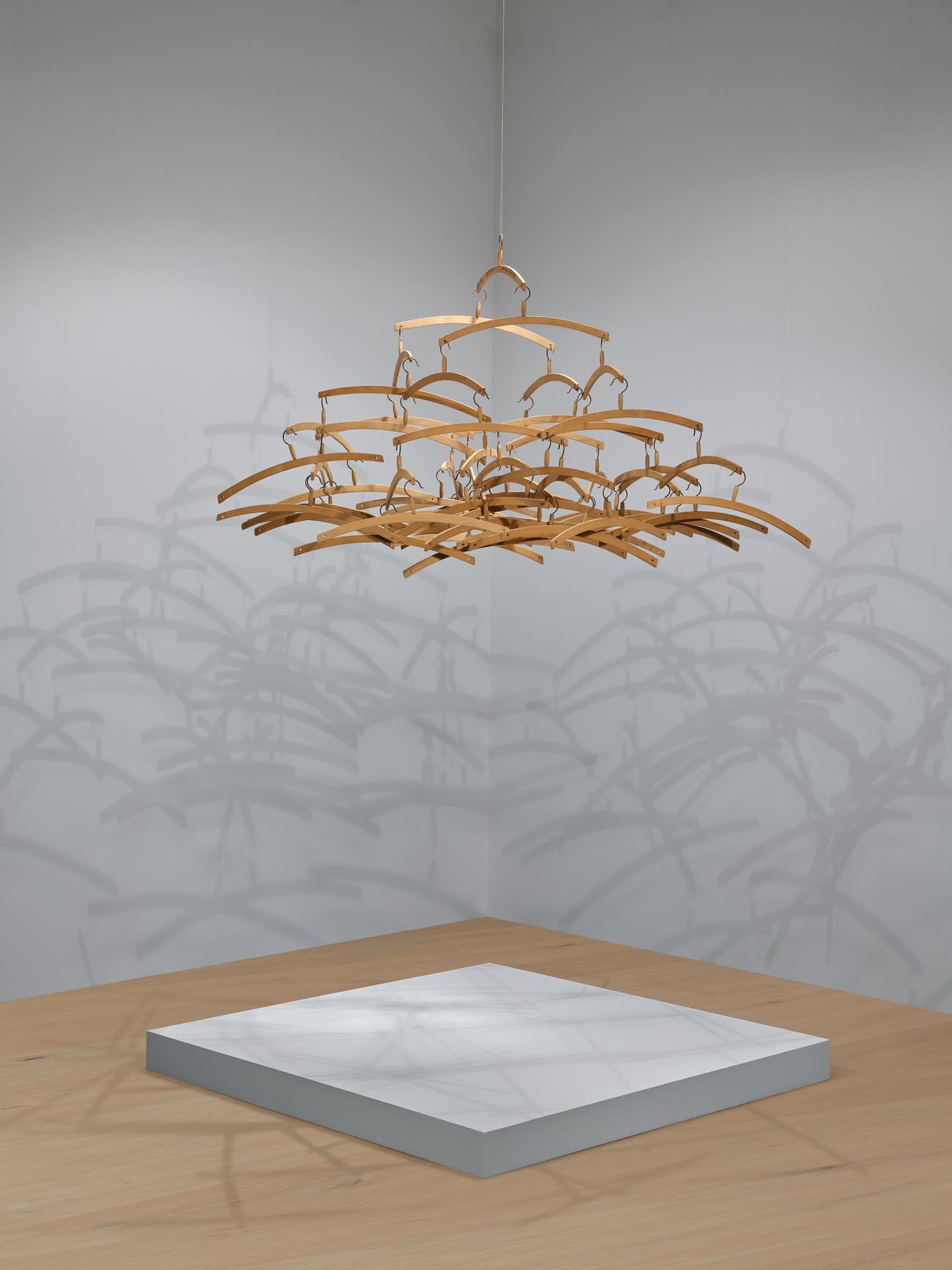 Multiple comprised of 63 wooden hangers (plus one extra hanger), accompanied by instructional lithograph in purple, on Arches paper, with full margins.