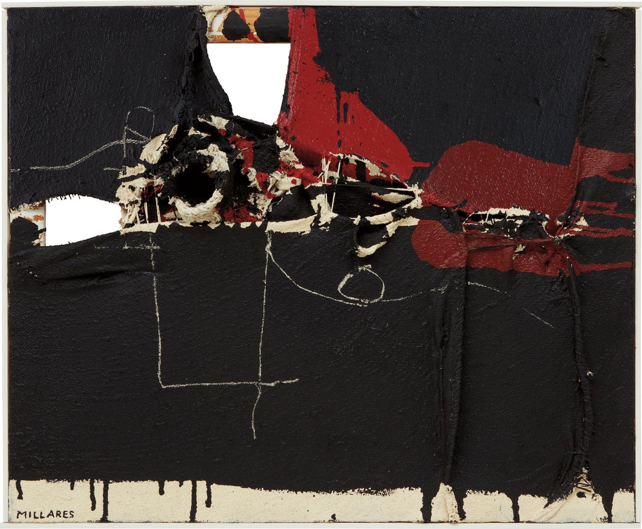 signed 'MILLARES' lower left; further signed, titled and dated 'MILLARES - "CUADRO 128" / 61' on the stretcher