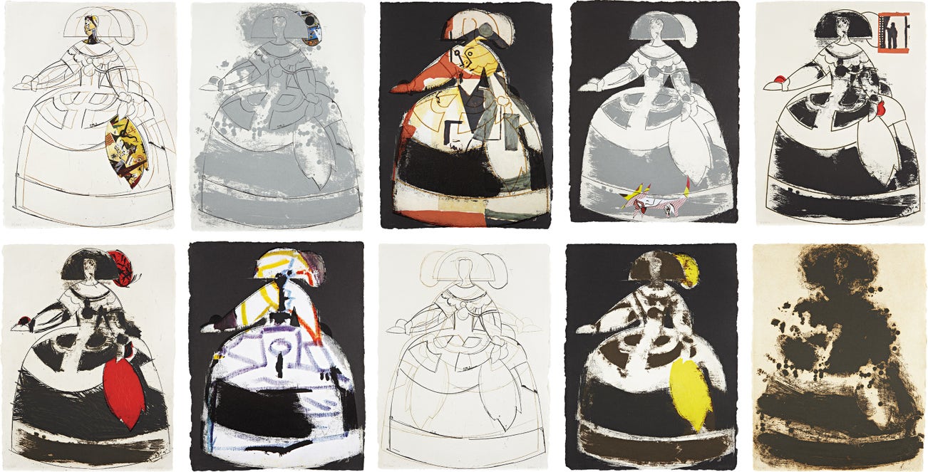 The complete set of ten etchings in colours, on Eskulan handmade paper, the full sheets, with accompanying book containing illustrations by the artist and the essay Dancing Notes on Las Meninas by Josep Palau I Sabre, the sheets loose (as issued) contained in the original printed and embossed paper-covered portfolio and original printed Plexiglas folder.