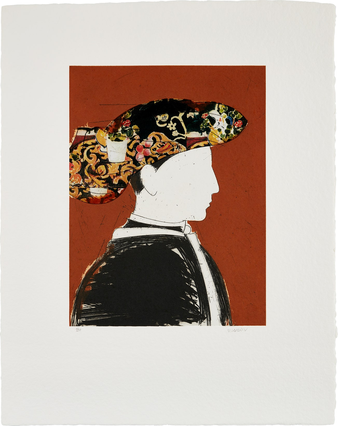Etching and aquatint in colors with unique collage, on heavy wove paper, with full margins.