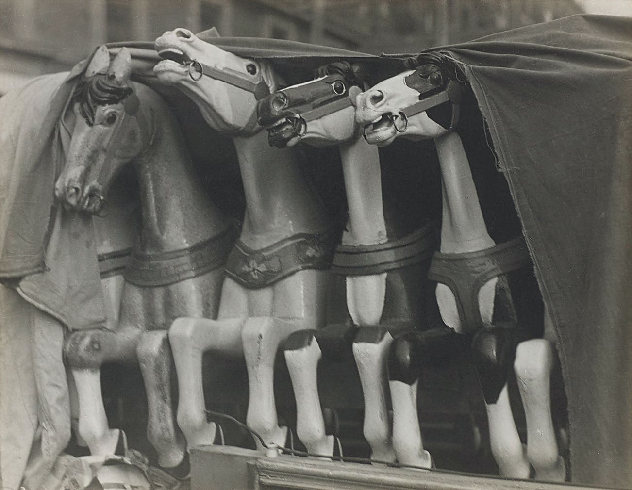 Despite these early Surrealist associations, Álvarez Bravo never himself claimed to be a Surrealist. Instead, his photographs speak to his cultural heritage and the indigenous roots of the Mexican people who, in the aftermath of a horrendous civil war, were facing rapid modernization. One can look at this striking image, of wooden carousel horses wrapped and presumably being carted away, as a poetic metaphor for the conflicts in Mexico’s post-revolution era.