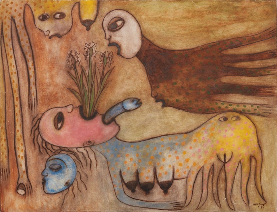 Manuel Mendive's artistic vision is shaped by Cuban culture, Santería, daily life and the creative spirit. The world Mendive designs in his artwork often combines water, fish and plants that together create a fantastical accord. The present lot has a mystical quality and includes Mendive's signature anamorphic figures situated in an elaborate, mythological landscape. Commonly regarded as a key player in the Cuban vanguard movement of the 1960s, Mendive's work is concerned with the sociocultural promotion of Afro-Cuban culture and its impact on Cuban identity. His works are infused with imagery that relates to his African heritage and Santería as both a religion and cultural staple of Cuba. The artist's work is included in many museum collections including the National Museum of Fine Arts in Havana, the Ethnographic Museum of Budapest, and the Museum of Modern Art in Paris, among others. He will be the subject of a major exhibition opening at the Bronx Museum of Art in July of this year, titled Manuel Mendive: Nature, Spirit, and Body.