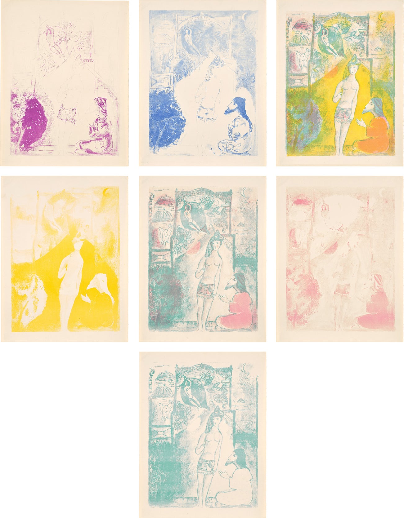 In all, Chagall created 12 different images illustrating the four tales. He printed them in editions of 90, 11 and 10. The edition of 10 was made special by Chagall to include a sheet of each different color printed on its own or in combination - probably to show how a multi-color lithograph is made and the amount of work involved to get to the final image. This lot contains impressions from the rare color progressive proofs which make up the final image. Lots 3, 4 and 5 are examples of the final signed and numbered, full color, states.