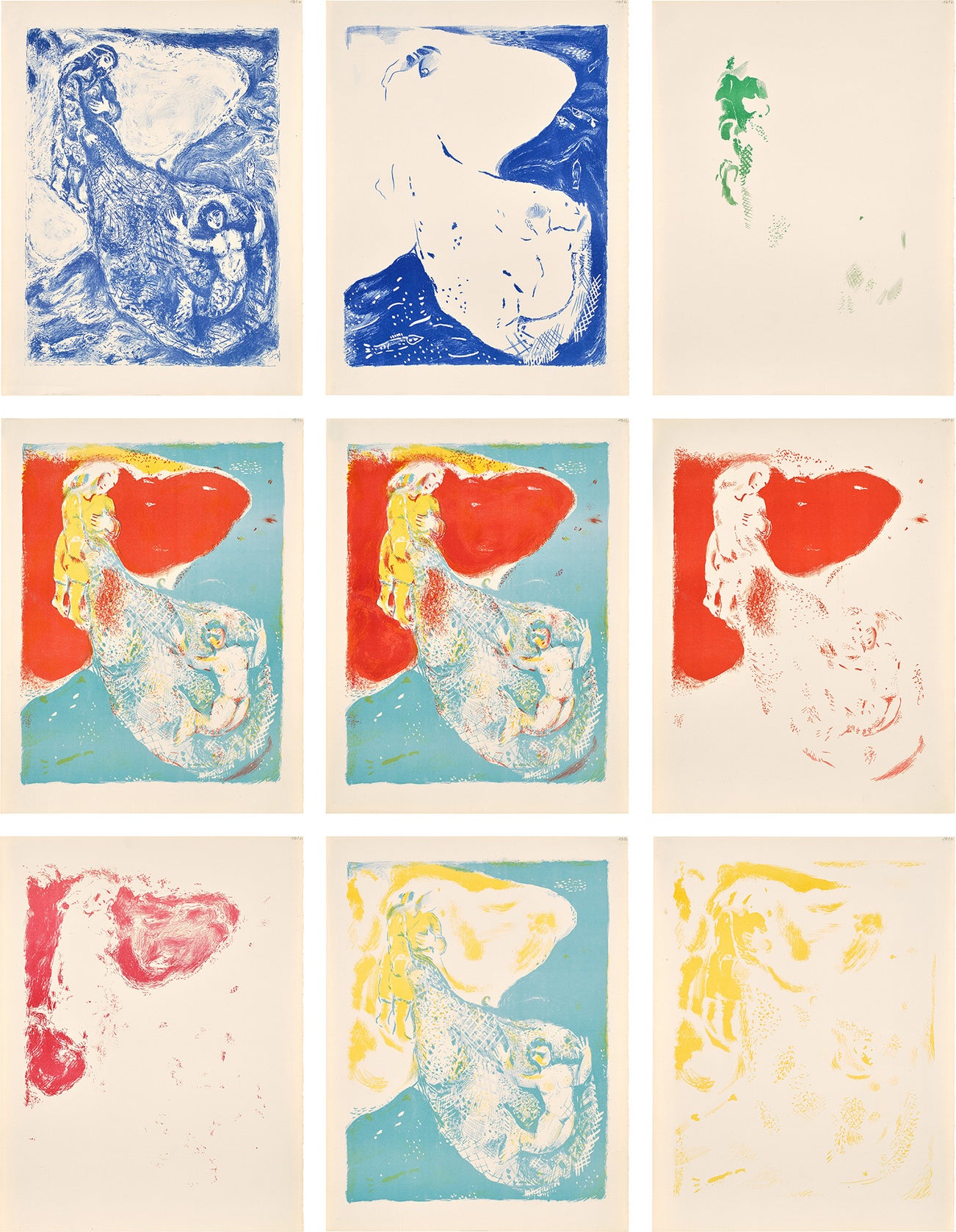 In all, Chagall created 12 different images illustrating the four tales. He printed them in editions of 90, 11 and 10. The edition of 10 was made special by Chagall to include a sheet of each different color printed on its own or in combination - probably to show how a multi-color lithograph is made and the amount of work involved to get to the final image. This lot contains impressions from the rare color progressive proofs which make up the final image. Lots 3, 4 and 5 are examples of the final signed and numbered, full color, states.
