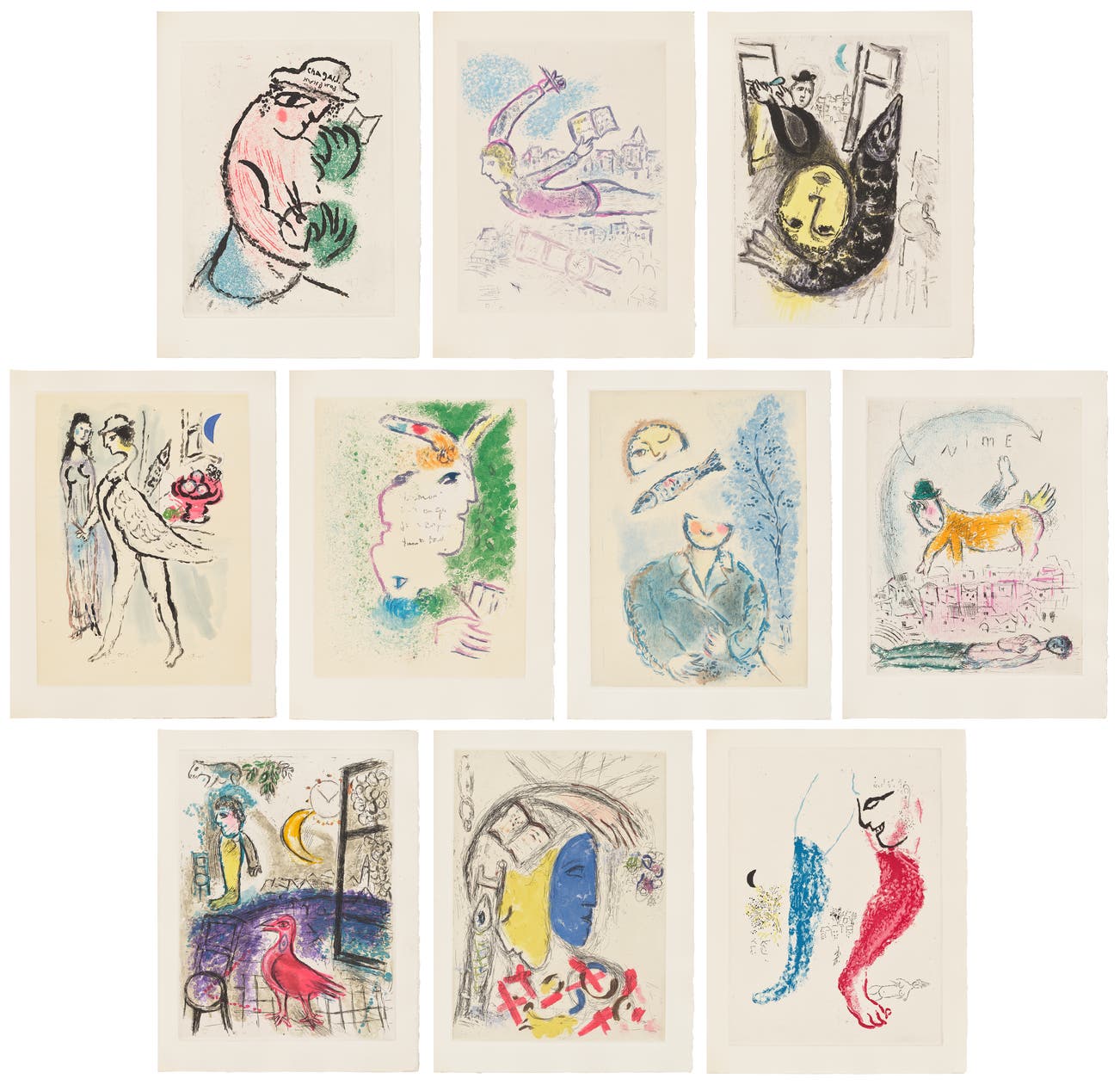 The complete set of 10 etching and aquatints in colors, on Arches paper, with full margins, with title page, text in French by Jean Paulhan, justification, all folded and loose (as issued), all contained in the original paper-covered boards and slipcase.