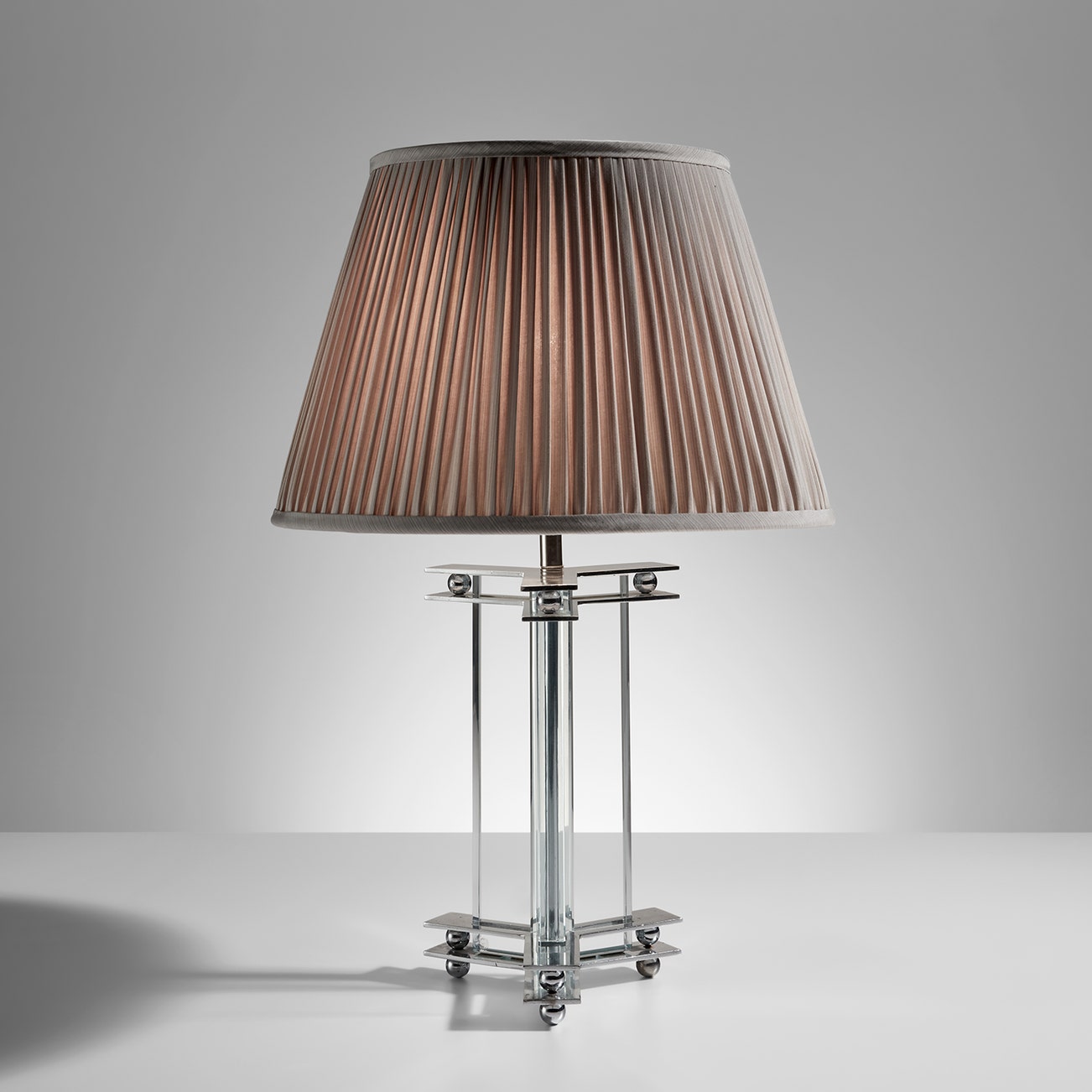 Glass, nickel-plated metal, fabric shade.