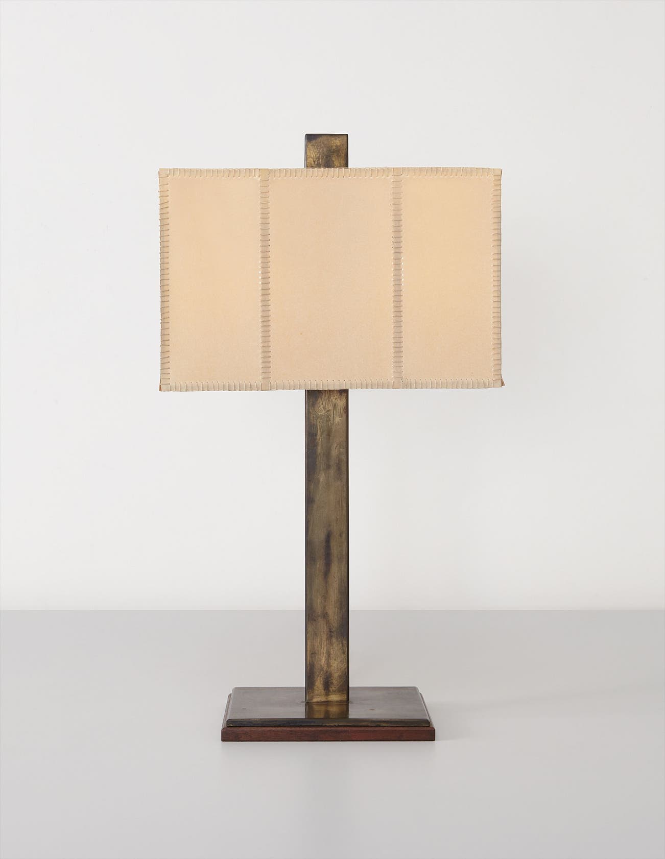 Bronze-plated iron, mahogany, faux-parchment shade.