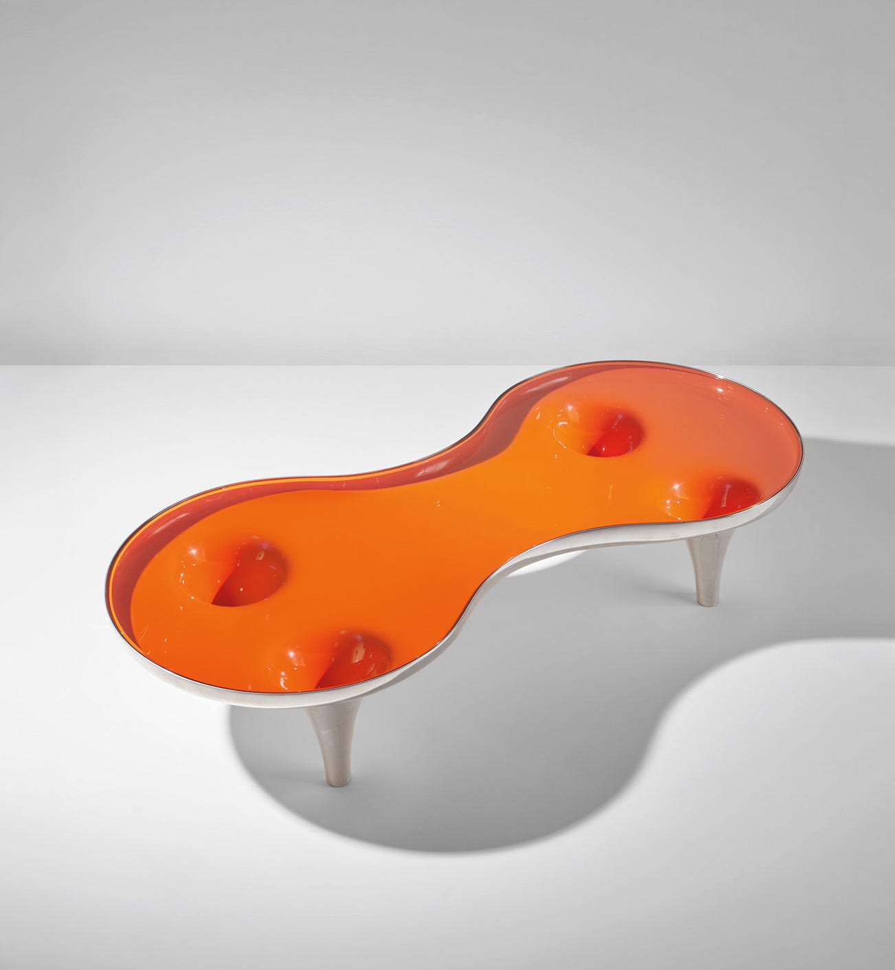 The aluminum and enameled surfaces of the table take on an almost life-like sense of motion, with its ductile surfaces and curvilinear edges. The polished aluminum exterior is sleek and curvaceous along the edges of the table's base but also in the hourglass motif seen in the shape of the tabletop. Just like the polished aluminum exterior of the table, the saturated pop of orange in the table’s interior is shiny and sleek. Four holes in the table’s interior—what look like vortexes—form the coffee table’s legs. This aspect of the design is similar to many of Newson’s works that play with dimensionality, revealing voids and centers. In Newson's words, these exposed cores are “a good way of revealing some high-quality manufacturing!”
