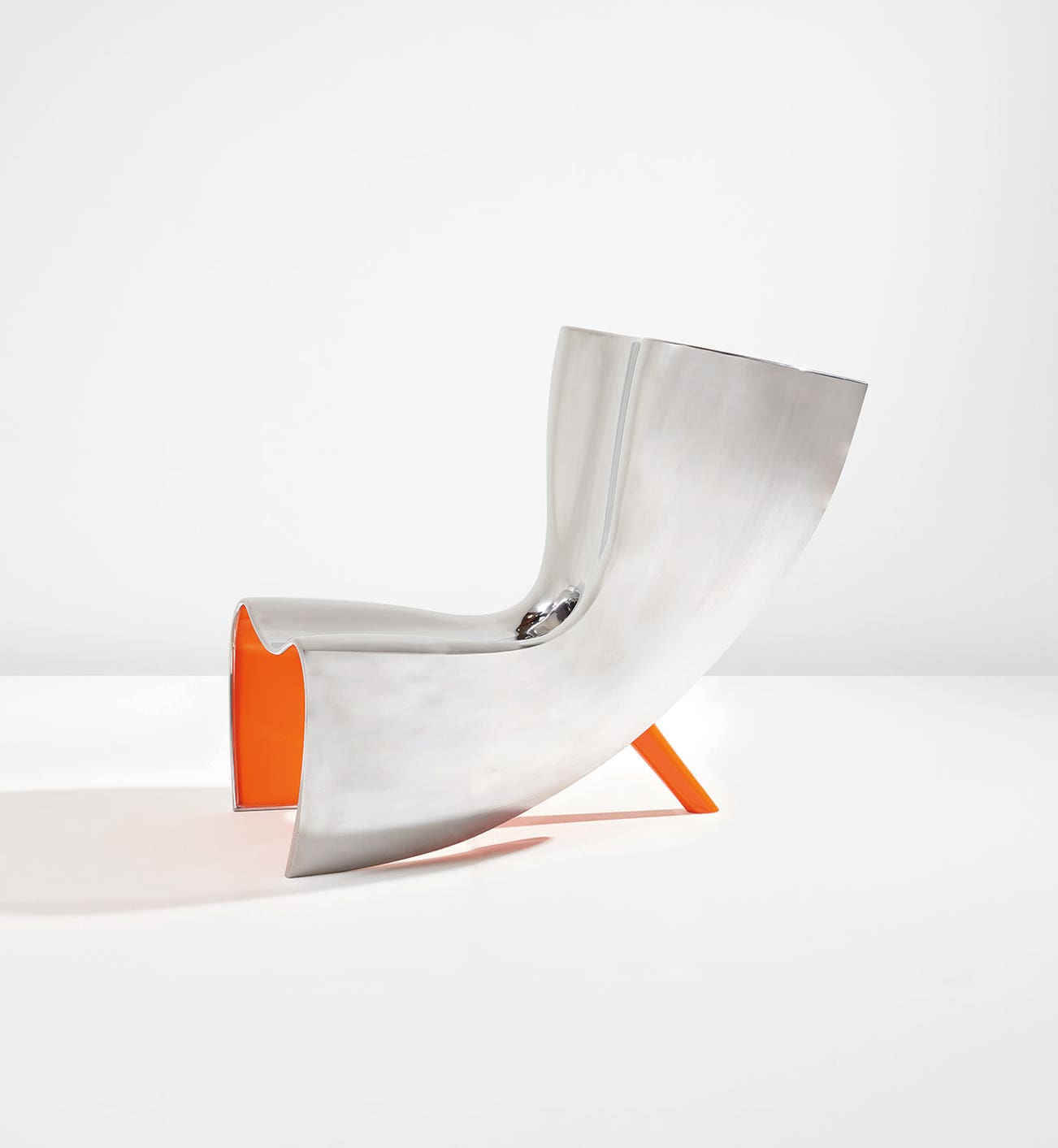 Produced at the same moment, in the same shop, by the same team of craftsmen, the Alufelt Chair summarily deconstructed the illusionistic metal fabrication techniques Newson had only just perfected. Alufelt shares the same bulbous, hourglass shape and polished surface of the Orgone designs, but unlike those seamless, tubular works, its form is not fully enclosed. Instead, Newson left a conspicuous split along the back of the chair that exposed its enameled interior and splayed the edges of the sheet metal “skin” into self-supporting legs, transforming the Orgone Chair’s extruded macaroni shape into a folded farfalle. The chair’s brightly colored underside highlights the dualism between obverse and reverse, and its stiletto-like rear leg appears to funnel away from the seat’s surface, forming a hollow vortex in the horizontal plane and further reinforcing its flatness.