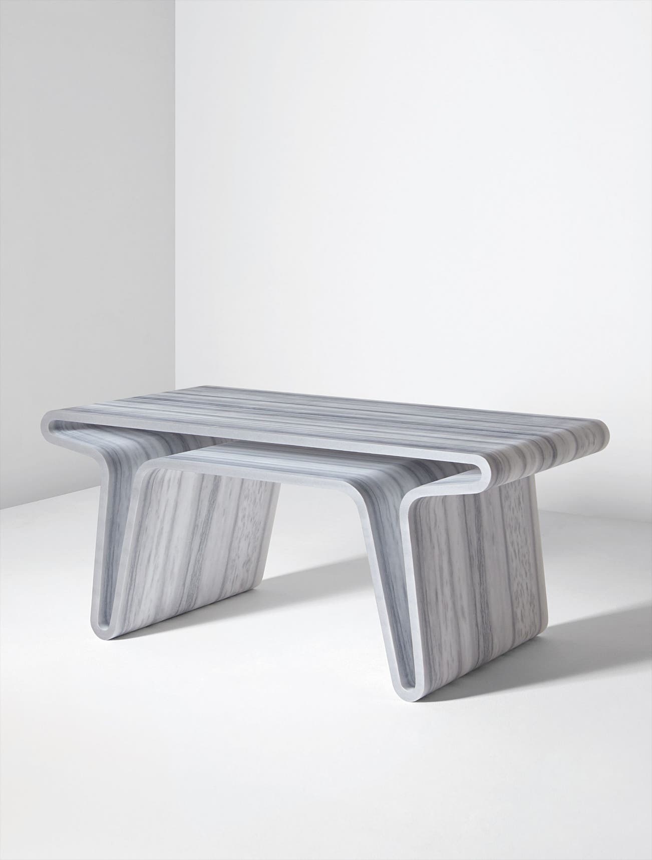 Marc Newson’s “Extruded Table 3” is a conceptual rendering of a process completely at odds with the table's actual production and materiality. Newson was attracted to marble’s associations with significant monumental works, high levels of craftsmanship and historic durability. However, as marble cannot be extruded, Newson’s adoption of the term is in service to his communication of a two-dimensional idea in a three-dimensional context. With noted similarity to the “Event Horizon” series, these works in marble distill many of the themes present in Newson’s earlier work—voids, negative versus positive space, and stunning feats of fabrication. He has said “The earlier aluminum works were all about what was going on inside. I was trying to create the illusion that the interior was bigger than the exterior. Now I see that the new marble works are dealing with the same ideas but in different ways.”(Marc Newson, exh. cat., Gagosian Gallery, New York, 2007, pp. 71-72)