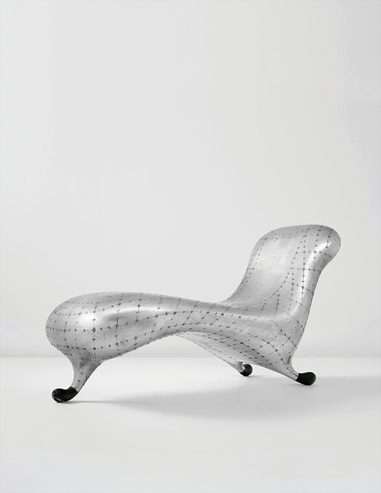 Through its labour-intensive and artisanal production, ‘Lockheed Lounge’ reveals an inherent understanding of the relationship between the human body and an object. Newson’s sculptural sensibility, informed by his training as a jeweller, has drawn parallels between ‘Lockheed’ and Alexander Archipenko’s aluminium bolide ‘Torso in Space’ of 1936. Writing of his own work the Ukrainian-born Archipenko noted, ‘Reflection enriches the effect of the object… it can amplify or reduce the effect of forms, colours or line; it can transform shadow according to the positions of the planes or the concave or convex bending of the reflecting metal. Reflections express depth and space; they absorb the entire environment to which they are exposed...’ As one of the most discussed and coveted design objects of the last few decades, the ‘Lockheed’ absorbs, amplifies and reflects the environment from which its futuristic sensuality emerged. It was the break-through piece that established, very early in his career, Newson’s approach to design as an ‘experimental exercise’ in extreme structure combined with a tactile and rigorous exploration of materials, processes and skills. It encapsulated his distinctive position outside any existing aesthetic movement while drawing on varied sources including neo-classicism, biomorphism, the space race and surf culture.