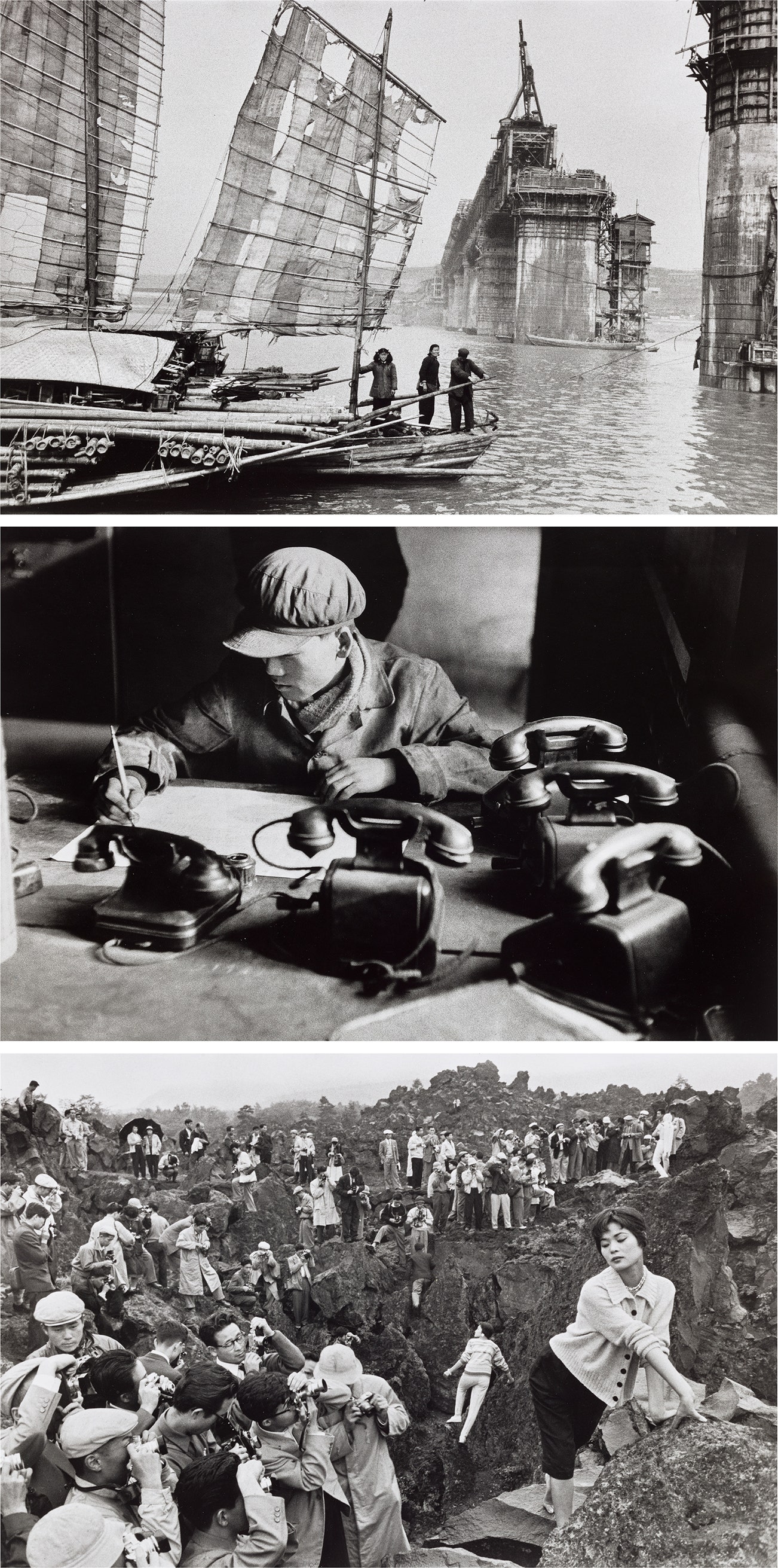 Junk in front of the construction site of a bridge over Yang-tseu-kiang, Wuhan, 1957; Engineers' Office, Anshan, 1957; Photographers' Rally, Karuizawa, 1958