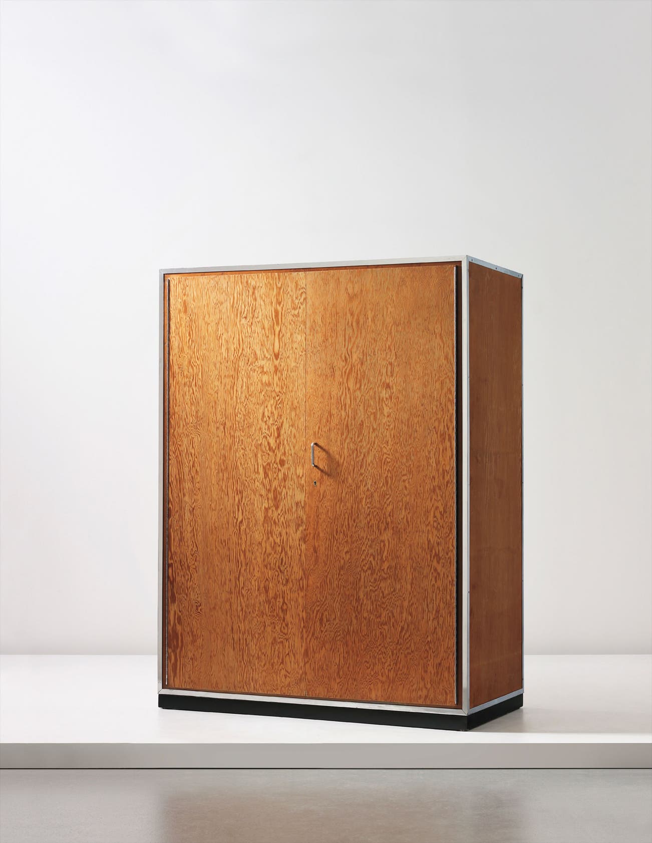 Oregon pine-veneered plywood, chromium-plated metal, linoleum.