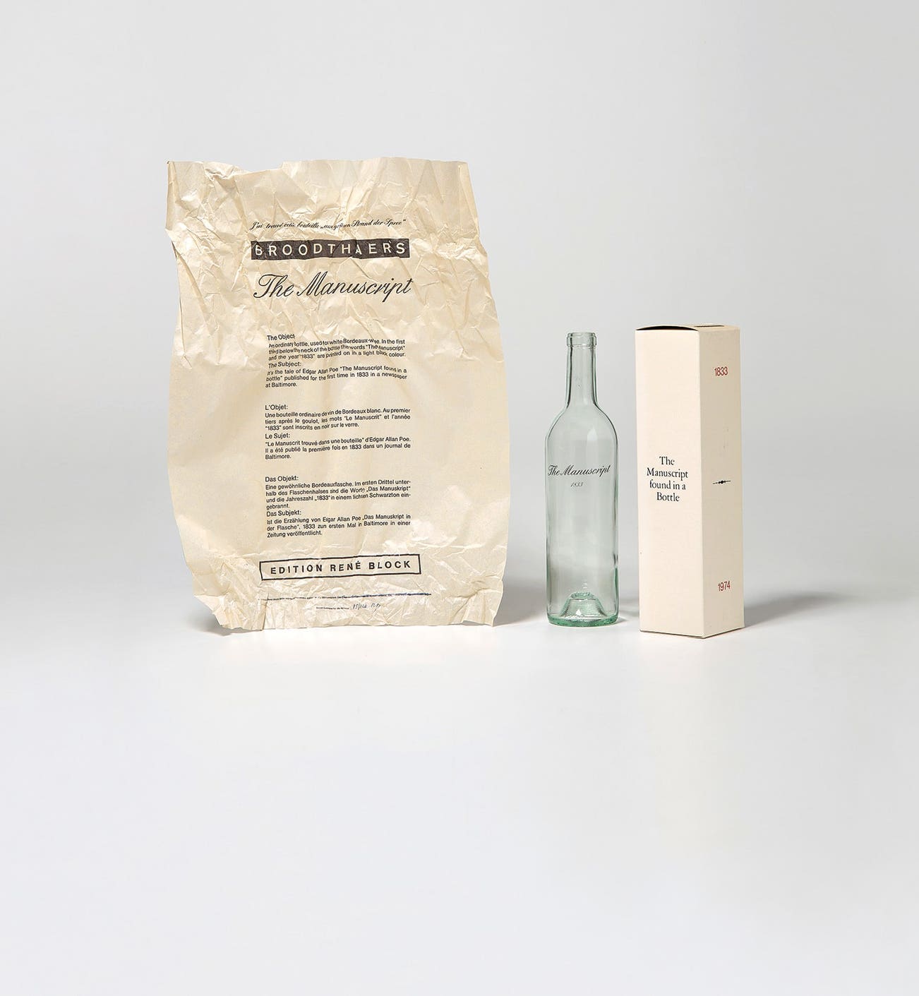 Glass bottle with printed title, tissue paper with printed text, and cardboard box.