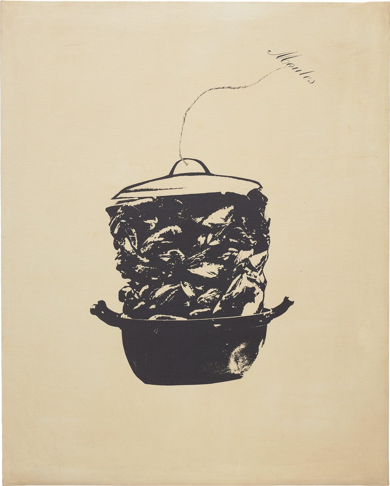 A celebration of one of Marcel Broodthaers’ most important motifs, Moules, 1967, presents an inky black casserole brimming with mussel shells on a blank canvas, the lid of the pan spelling out ‘Moules’, or ‘Mussels’ in French. At once formally straightforward and conceptually layered, the photographic work epitomises Broodthaers’ eccentric universe and irreverential practice, informed by his longstanding background in poetry. ‘I have been using since 1967 photo-canvases, films, slides, to establish the relationships between the object and the image of that object, and also those that exist between the sign and the meaning of a particular object: writing’, the artist said (Marcel Broodthaers, quoted in Michael Compton, 'In Praise of the Subject', Marcel Broodthaers, exh. cat., Walker Art Center, Minneapolis, 1989, p. 40). It is thus no coincidence that the work’s subject matter should be polysemic in French: ‘moules’ signifying not only ‘mussels’ but also ‘moulds’ – a nod to the animal’s capacity to make its own shell (and thus, so-to-speak, its own mould). Signifying the importance of mussels within Broodthaers’ visual lexicon, the symbol has appeared time and again in the artist’s work, notably in key formulations housed at the Museum of Modern Art, New York, and the Tate, London.