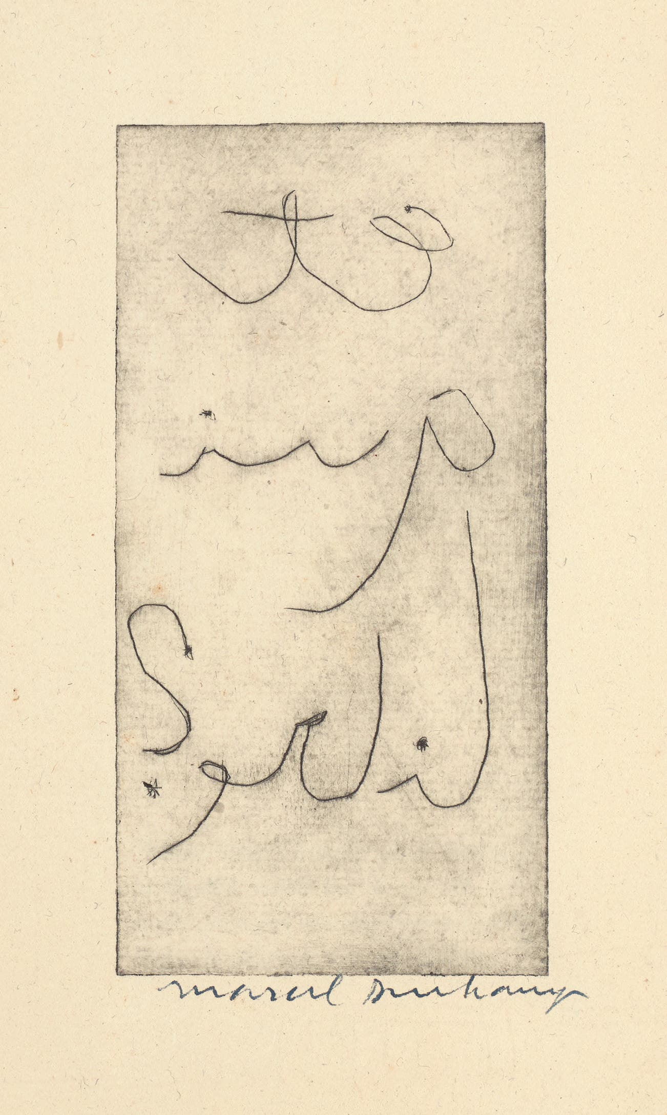 The drypoint signed by Marcel Duchamp in black ink, the booklet initialled by Pierre-André Benoit and numbered 14/40 in pencil on the end page (there were also 4 in Roman numerals that each included a suite of three signed etchings), published by Pierre-André Benoit, Alés, France.