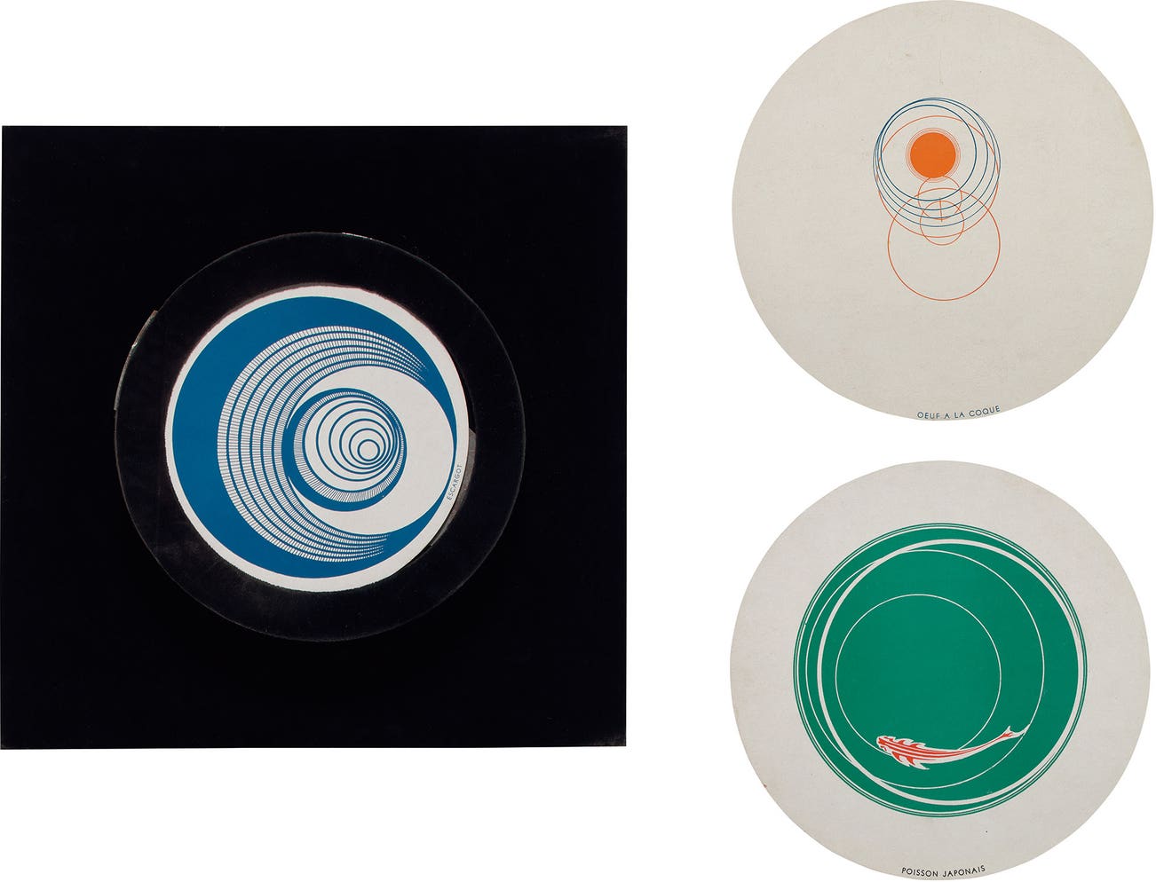 The complete set of twelve offset lithographs in colors, on six doublesided round card discs, all contained in the original round, black, plastic and foam folio, to be viewed as they rotate at 33 1/3 revolutions per minute on the velvet-covered wall-mounted turntable designed by Duchamp.