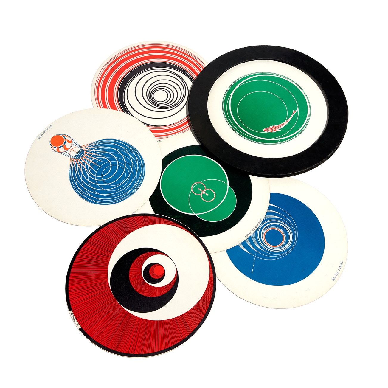 The complete set of 12 offset lithographs in colors, on six double-sided round card disks, accompanied by the original black plastic circular holder and viewer and cardboard collapsible sleeve with instructions.