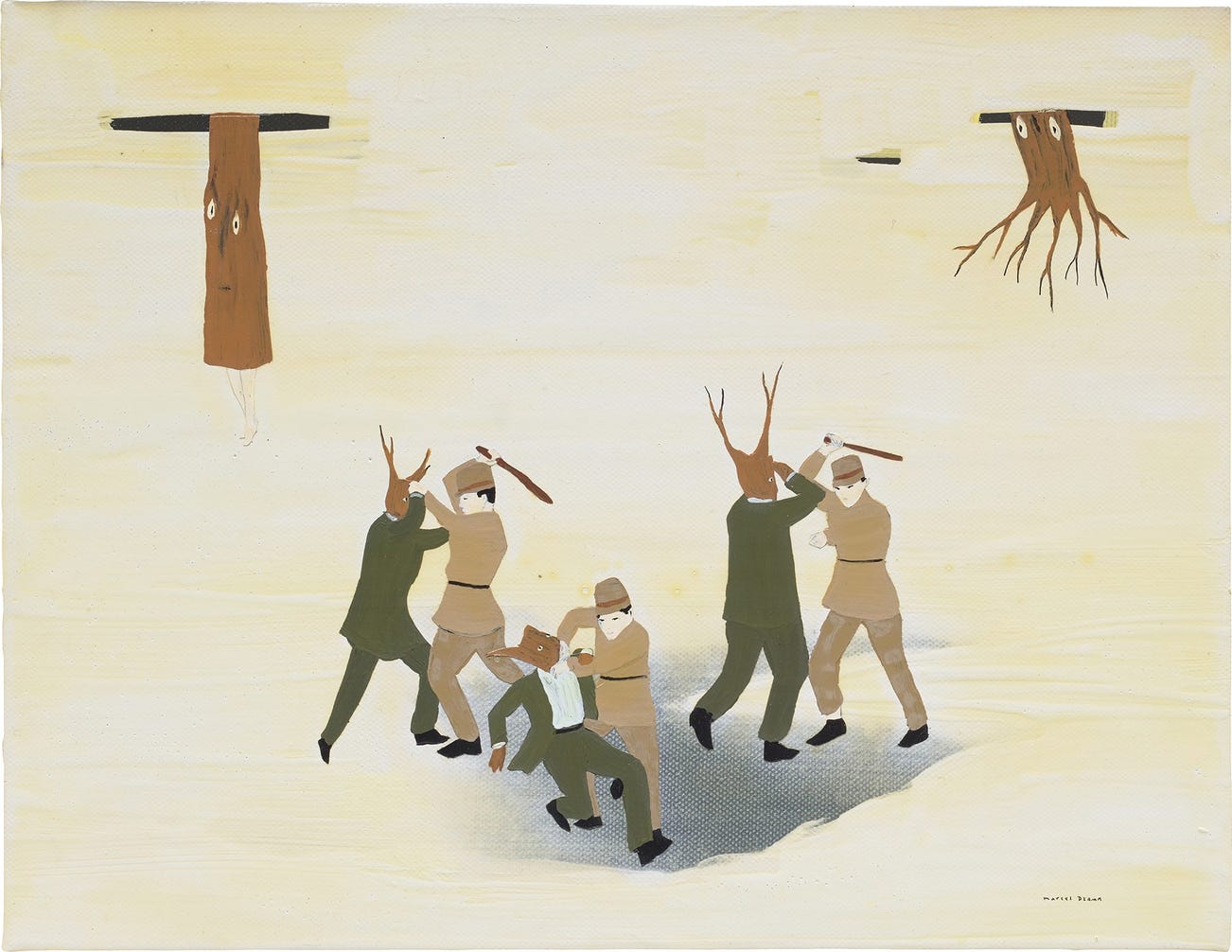 signed 'Marcel DZAMA' lower right; further signed with artist's initials, titled and dated 'HOW WE LOST, 2004 MD' on the stretcher