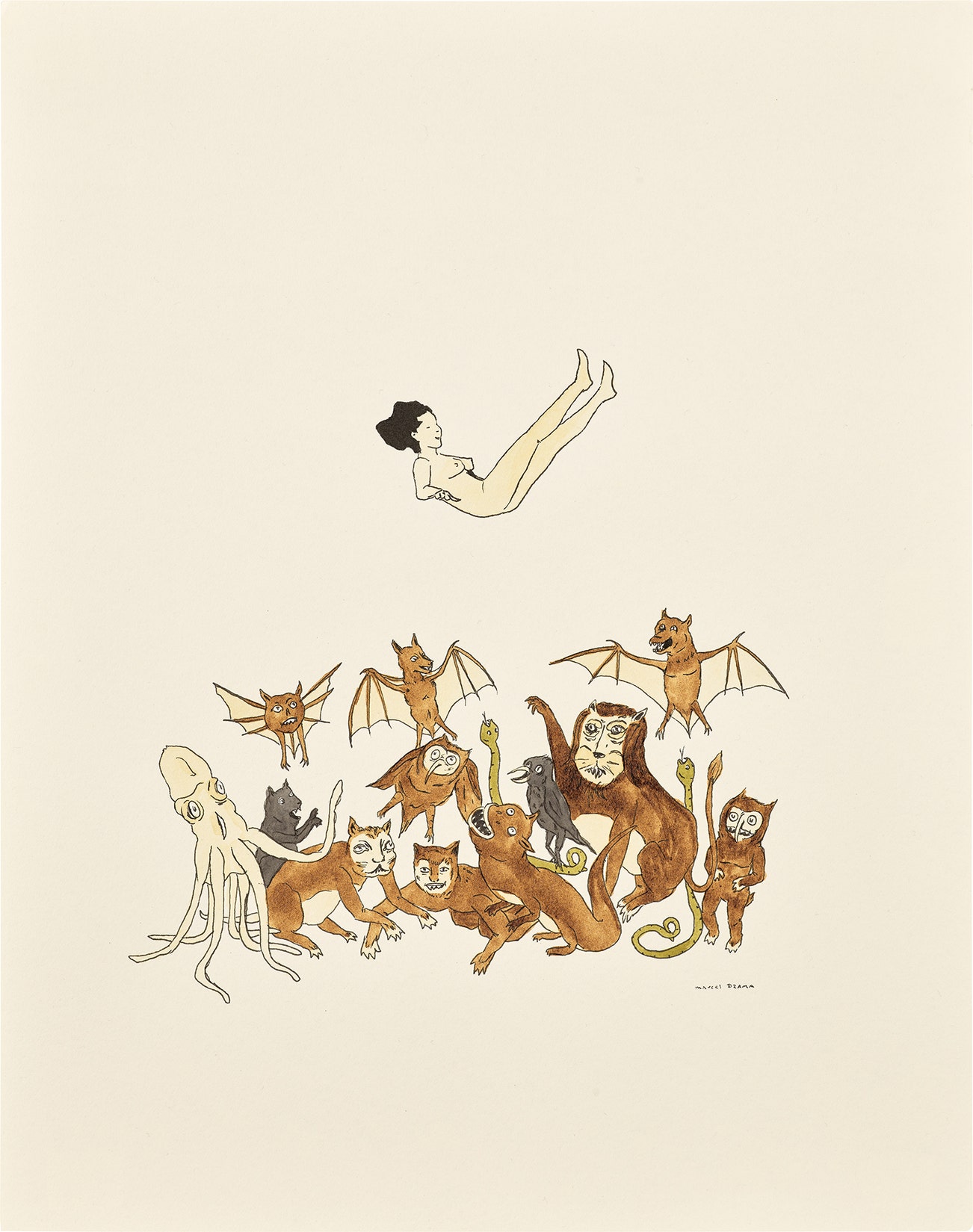 signed "Marcel Dzama" lower right; inscribed and dated "The Good days are gone 2003" on the reverse