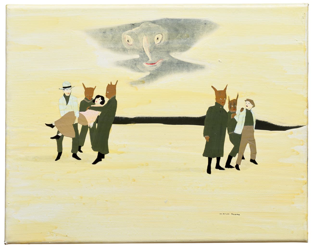 signed 'marcel DZAMA' lower right; signed with the artist's initials, titled and dated 'WARNING SIGN MD 2004' on the stretcher