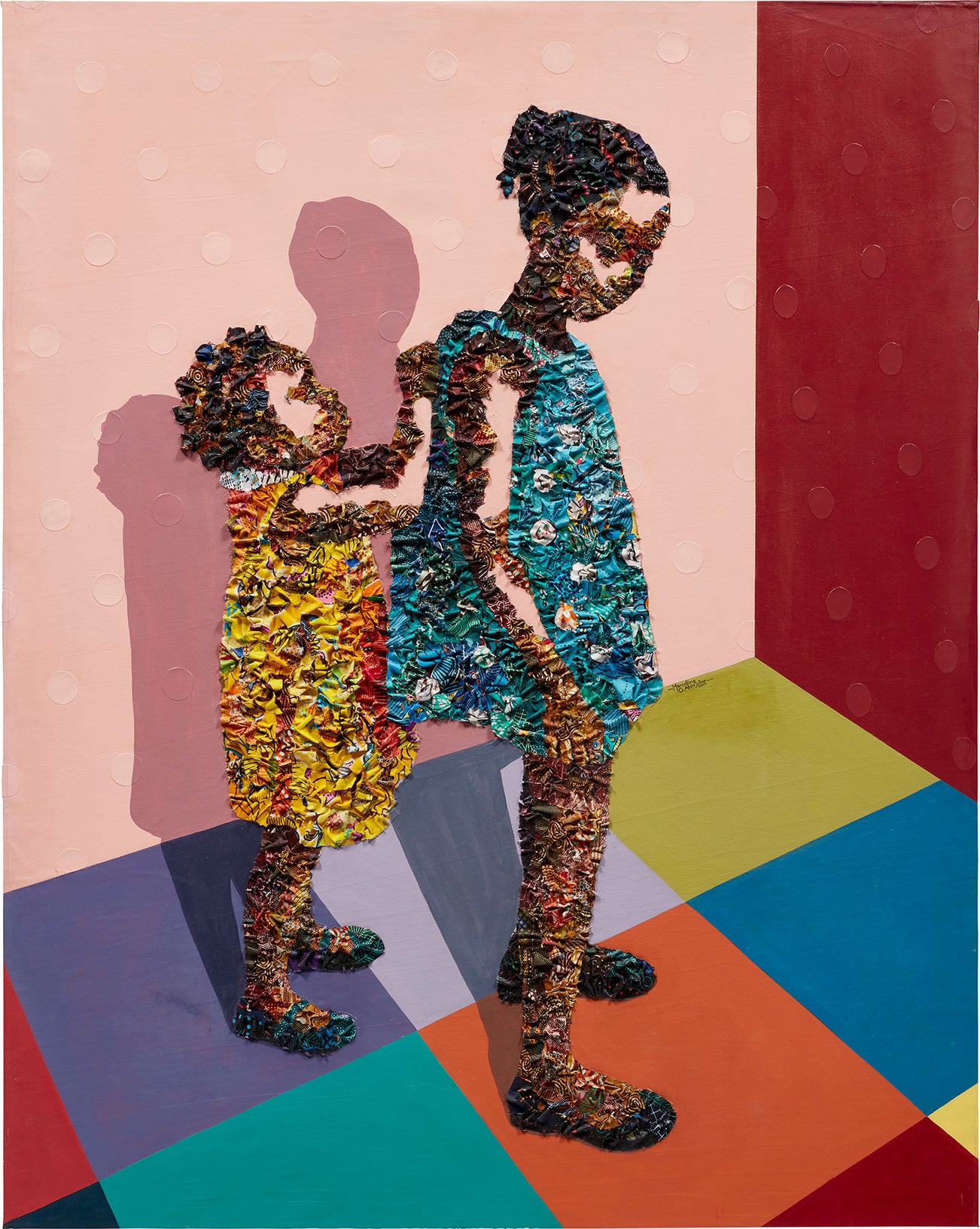 acrylic on fabric and paper collage on canvas