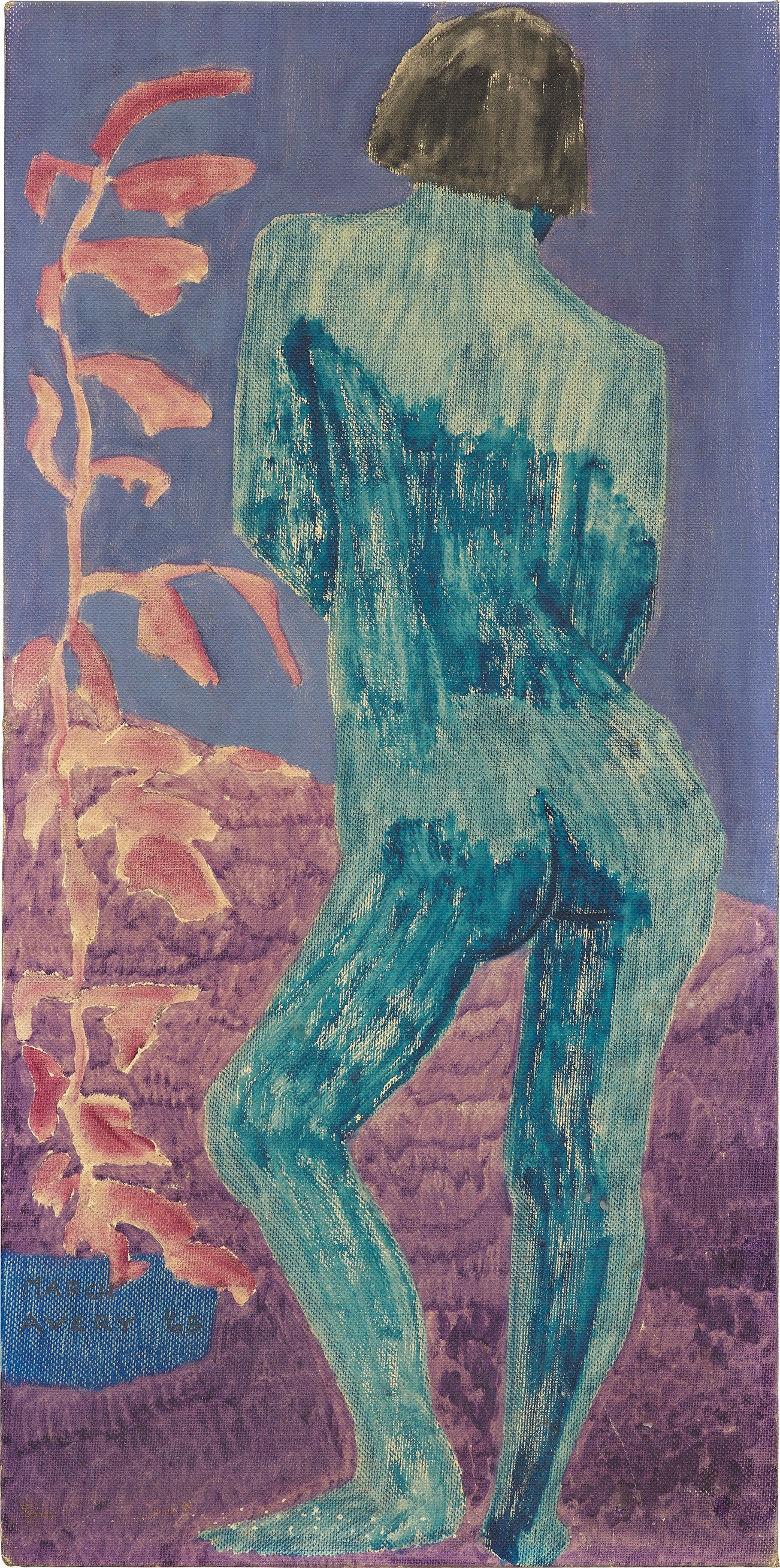 signed and dated "MARCH AVERY '65" lower left; signed, titled and dated "Blue Nude - backview by March Avery 1965" on the reverse