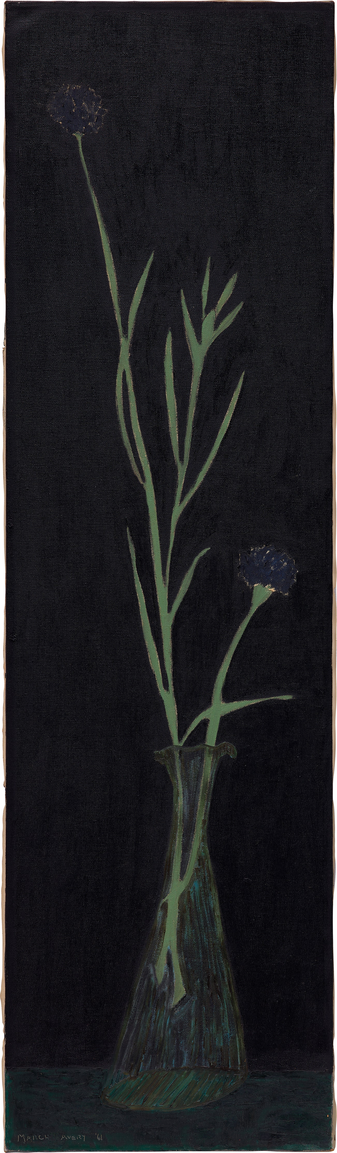 incised "MARCH AVERY '61" lower left; signed, titled and dated "Bachelor Buttons by MARCH AVERY 1961" on the stretcher