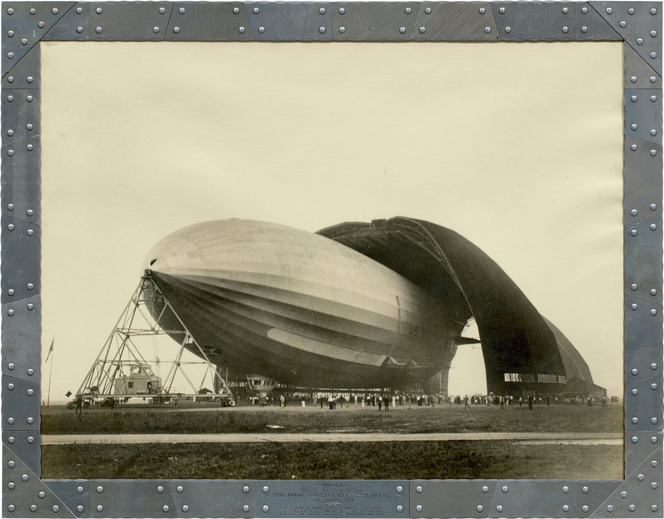 Margaret Bourke-White’s classic photograph of the USS Akron is presented here in its original presentation frame. The frame is made from Duralumin, the lightweight aluminum alloy used in the girder construction of the airship, built by the Goodyear Zeppelin Corporation for the United States Navy. Inscribed on the frame’s presentation plaque is a dedication to Dale Hutchinson, Winner of the Third Annual Goodyear Dealers Zeppelin Race, July-August 1931.