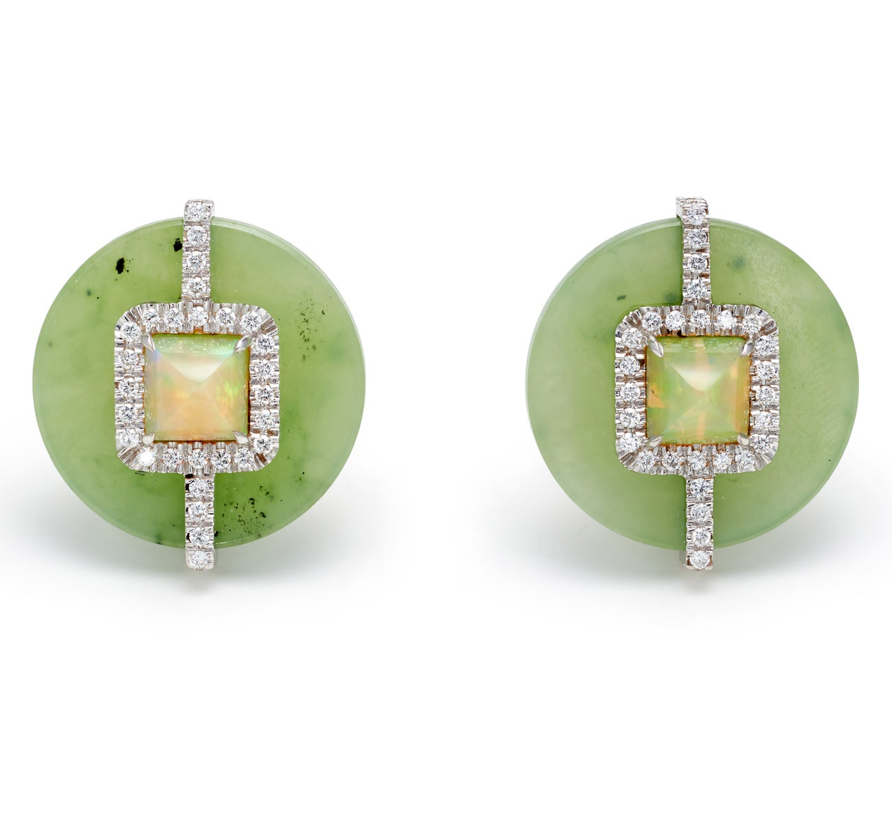 A Pair of Jade, Opal, Diamond and Gold Earrings
