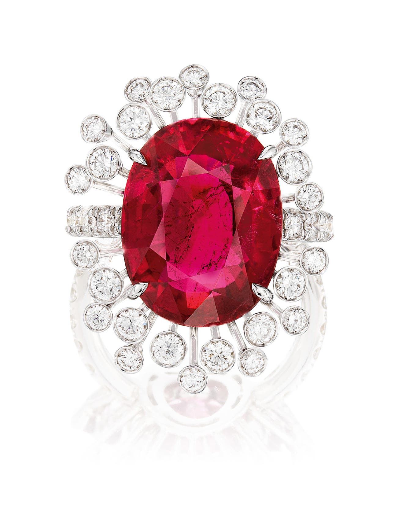 One oval rubellite tourmaline, approximately 12.05 caratsColllet-set diamonds in the surround and on the shank18 karat white goldItalian maker's mark
