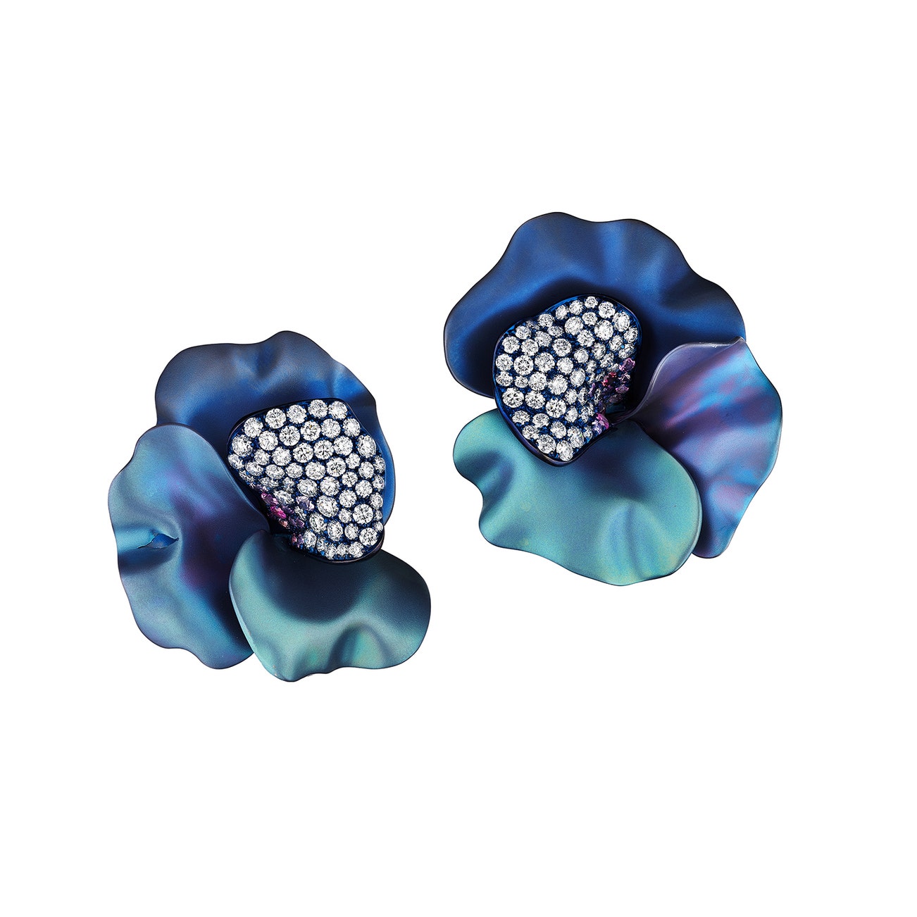 Each designed as a flower, the center petal set with brilliant-cut diamonds and circular-cut sapphires of pink tint, mounted in titanium, fold-down posts and clip back fittings, signed Margherita Burgener, numbered, with maker's mark, Italian assay mark and maker's mark, signed box.