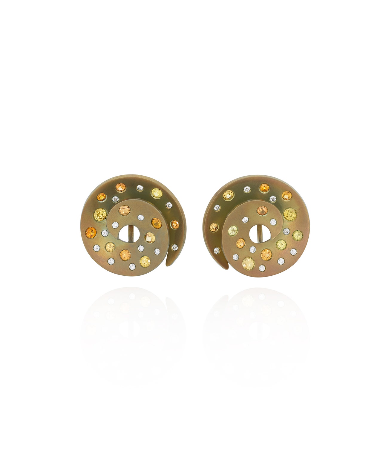 Of spiral design, each set with circular-cut yellow and orange sapphires and diamonds, length approximately 36mm, each signed Margherita Burgener, maker's mark for Margherita Burgener, Italian maker's mark and assay mark for gold, pouch, case and box stamped Margherita Burgener.