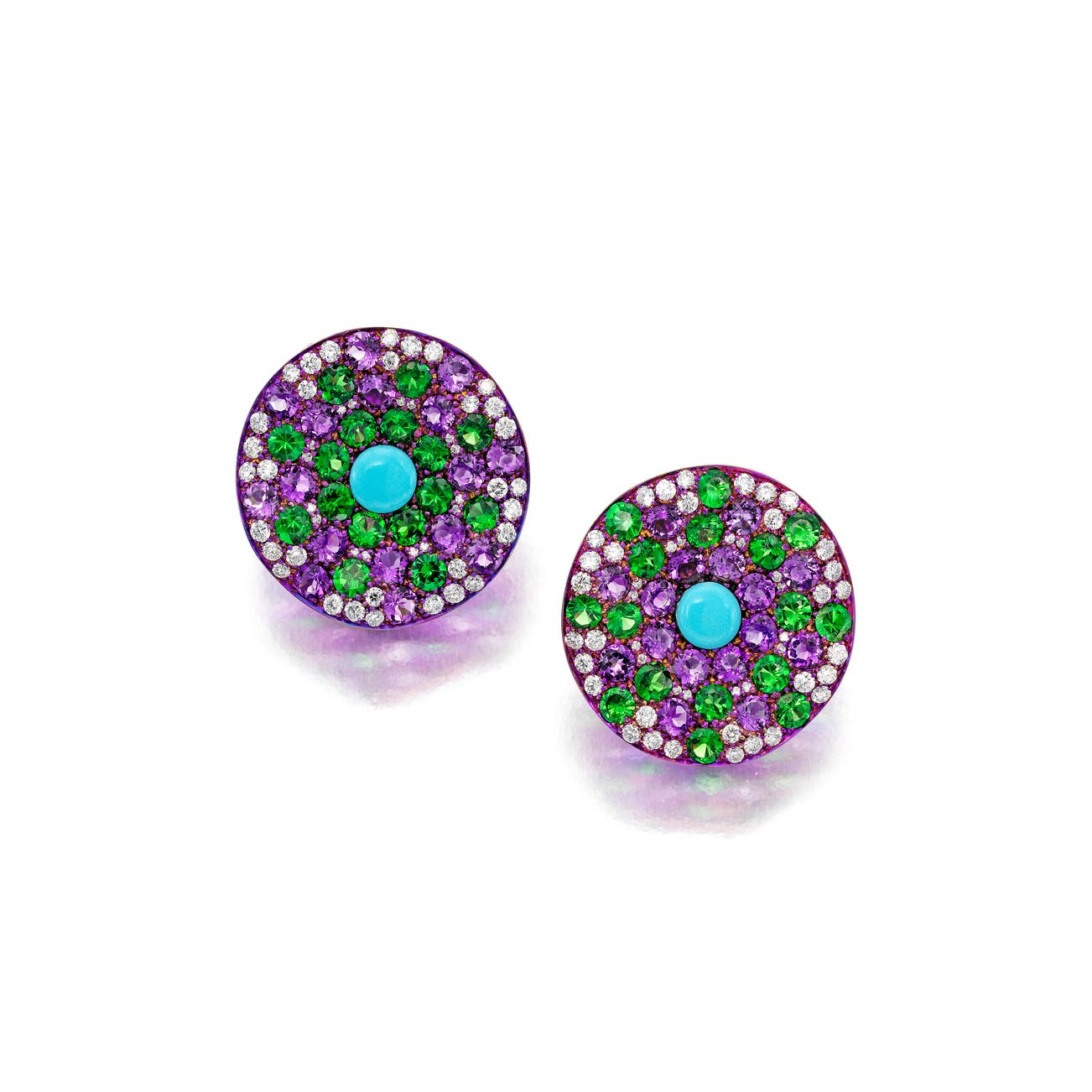 Each set with a cabochon turquoise, accented with circular-cut amethysts and tsavorite garnets and brilliant-cut diamonds, mounted in titanium and platinum, each signed Margherita Burgener, Italian maker's marks and assay marks, collapsible post and hinged-back fittings, diameter approximately 7/8 inch.