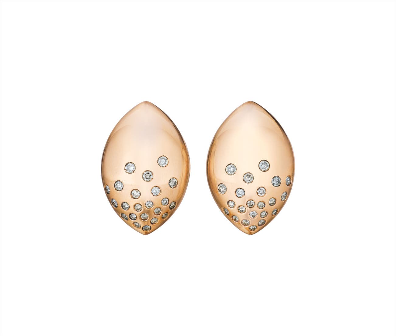 Each designed as a navette shaped bombé plaque, accented by circular-cut colored diamonds, mounted in 18K rose gold, length 1 1/8 inches.