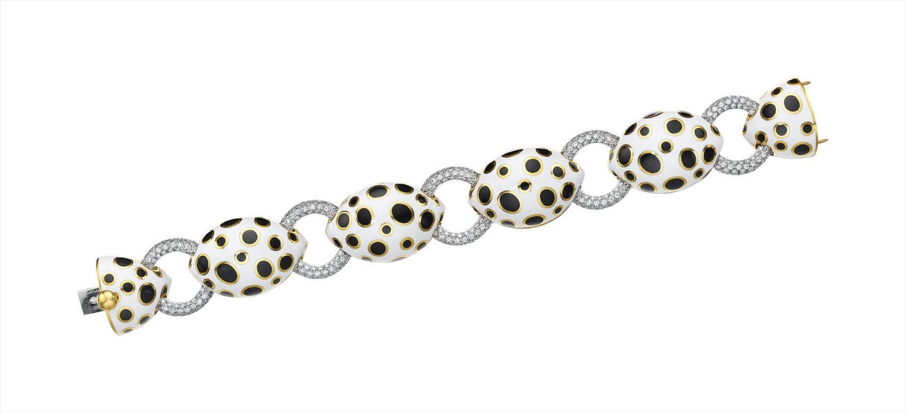 Designed as a series of alternating white enamel bombé panels and pavé-set diamond circular links, decorated with black and gold enamel polka dot motif, mounted in 18K yellow gold, length 7 1/2 inches.